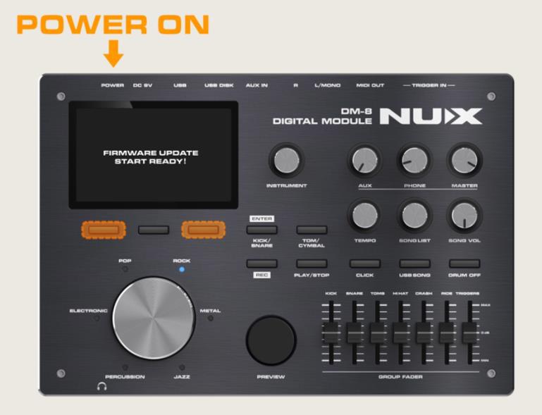 Press and hold the first and third buttons below the DM-8 display screen, then plug the 9V power adapter into the DC jack to enter upgrade mode