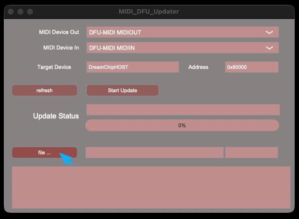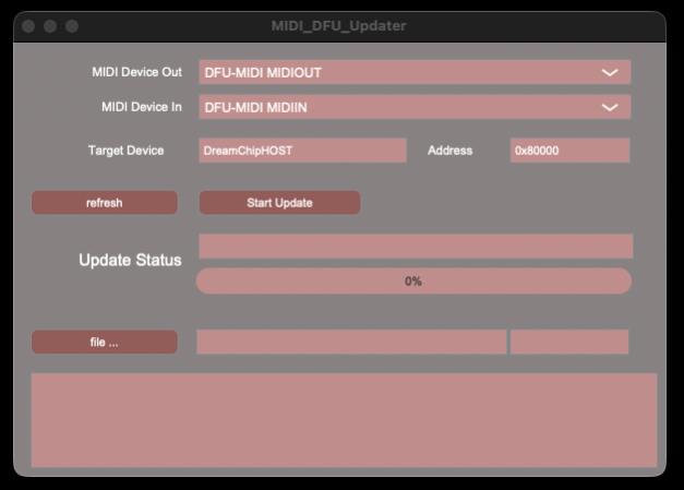 Set the “MIDI Device Out” and the “MIDI Device In” to “DFU-MIDI”. The “Target Device” should display: DreamChipHOST.
