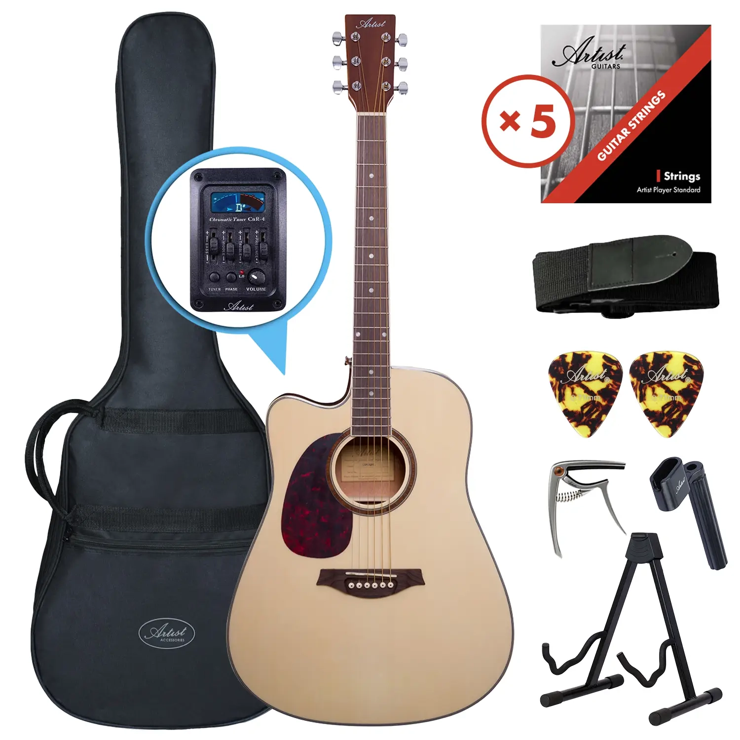 I decided to get back into playing the guitar. I searched the usual top brands and found them quite expensive ($3k for an electric acoustic guitar). I wanted to spend less because I was unsure if I'd stick with it. So I found 'artist guitars' and saw a deal for an acoustic guitar, five sets of strings, a gig bag, a capo and more for less than $300 (including post). I've never heard of artist guitars, but the offer was so good I decided to give it a shot (expecting something to be wrong). To my surprise, it was awesome. The guitar is fantastic; the strings are low to the fretboard and so easy to play. It sounds amazing, and I have a gig bag, stand, capo and more, so I've got everything I need. Very happy with this purchase. It is a great website, with a great offer and service. I highly recommend it and am considering buying my next electric guitar from you. Keep doing what you're doing, and you'll be a great success with truly delighted customers. Highly recommended : )