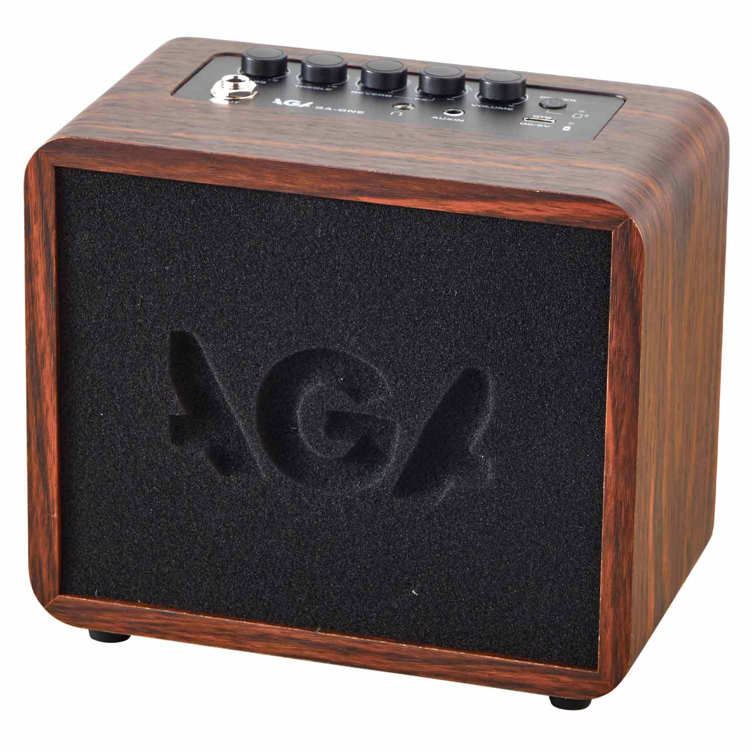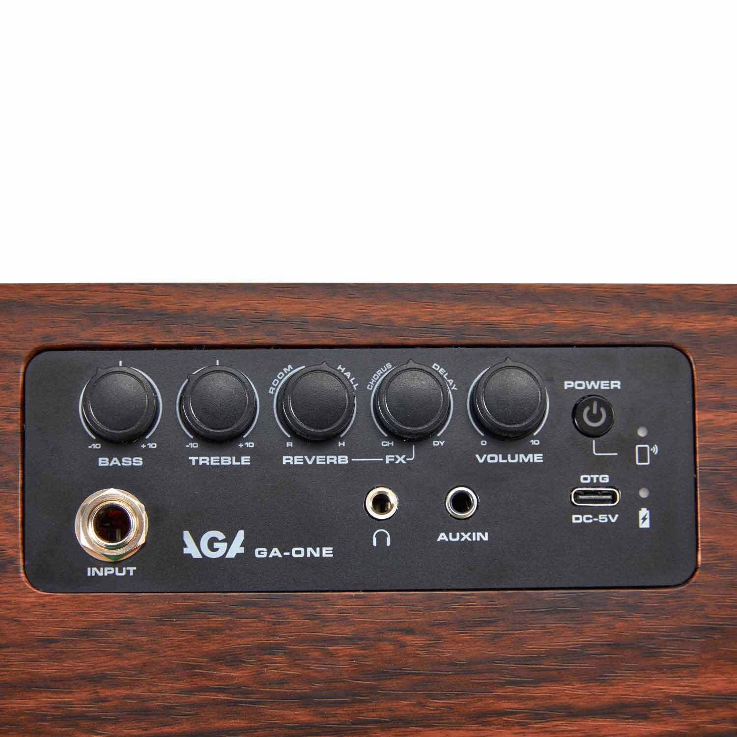 The AGA GA-ONE is an awesome, pint-sized acoustic guitar amplifier that doubles as a portable Bluetooth speaker! The 3" speaker, along with a 1.6" tweeter provide a nice, warm treble sound with no compromise on your low-mid and low frequencies. It's powered by a built-in rechargeable battery that sports a 2.5 hour runtime and is USB-C rechargeable. With an output of 15W RMS, this is perfect for home practice and singalongs with friends! It has an onboard FX processor with chorus/delay, and reverb. The headphone output allows for silent practice.