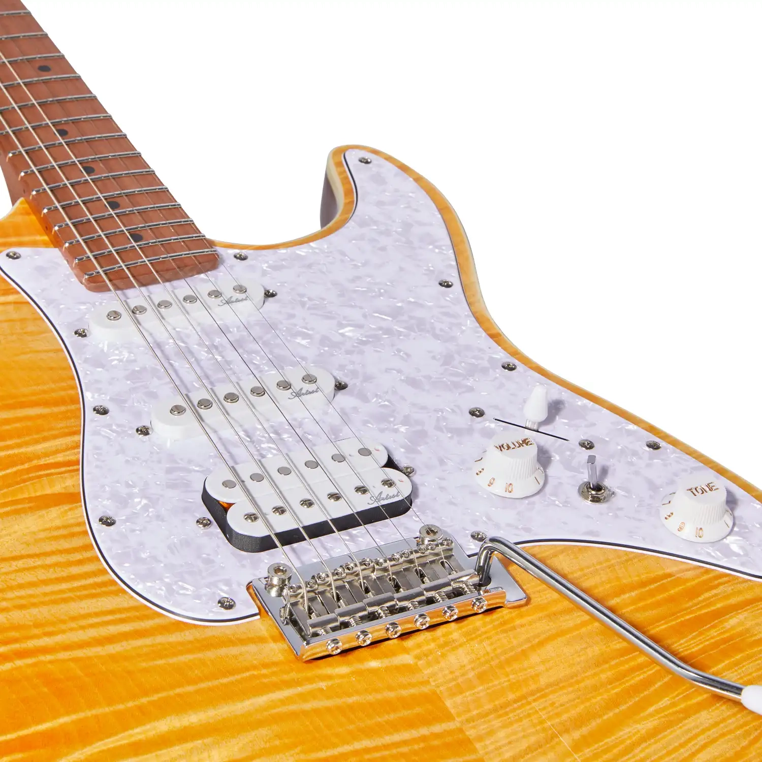 With 22 medium jumbo frets spanning the length of a satin-finished light-roasted maple neck, the AS30 feels immediately familiar in the hands, courtesy of a classic 9.5" radius maple fretboard built for shredders and rhythm players alike! A classic C-shape neck profile belies the AS30's flashy exterior, giving this one an ultra-comfortable feel for players of all persuasions. The vintage-style six-screw tremolo gives you the option to engage in classic rock screams and wails to your heart's content, safe in the knowledge that your tuning will remain rock-steady thanks to a set of high-grade chrome tuning machines and a rock-solid 42mm ABS nut.