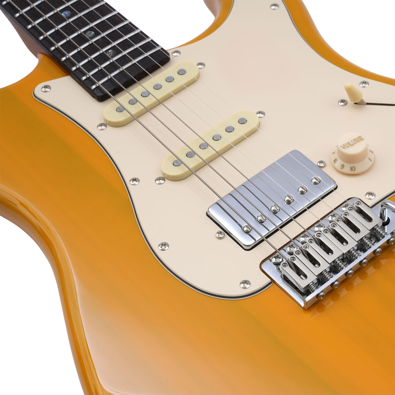 With an ultra-lightweight transparent finished paulownia body, modern electronics, and the most sought-after neck in our range, the all-new AS68 brings late 1960s flair to the 21st century in style. Featuring a quartersawn roasted maple neck topped with a stunning dark rosewood fretboard, this buttery yellow beast plays like butter... and if that wasn't enough, we've equipped this one with 22 stainless steel frets on a 14-inch radius fretboard, yielding ultra-low action, while glow-in-the-dark fret markers on the side of the neck map the fretboard on even the darkest of pub stages.