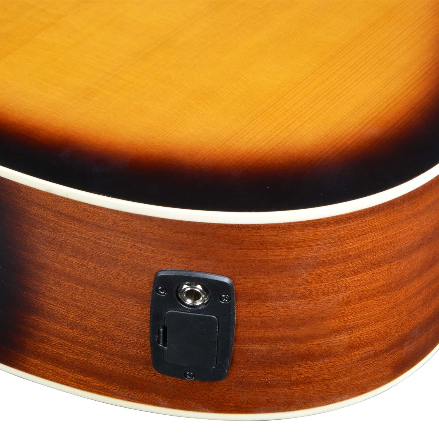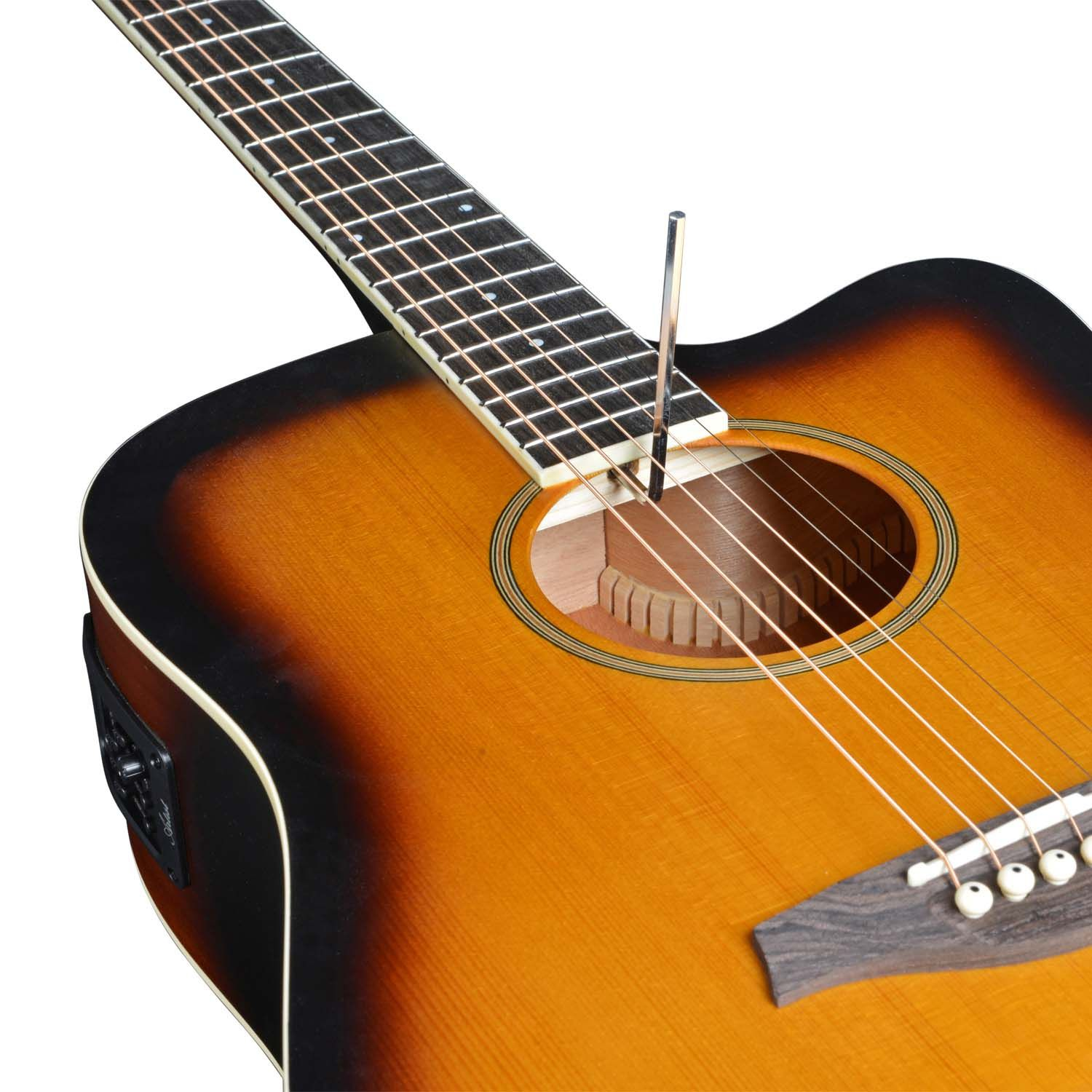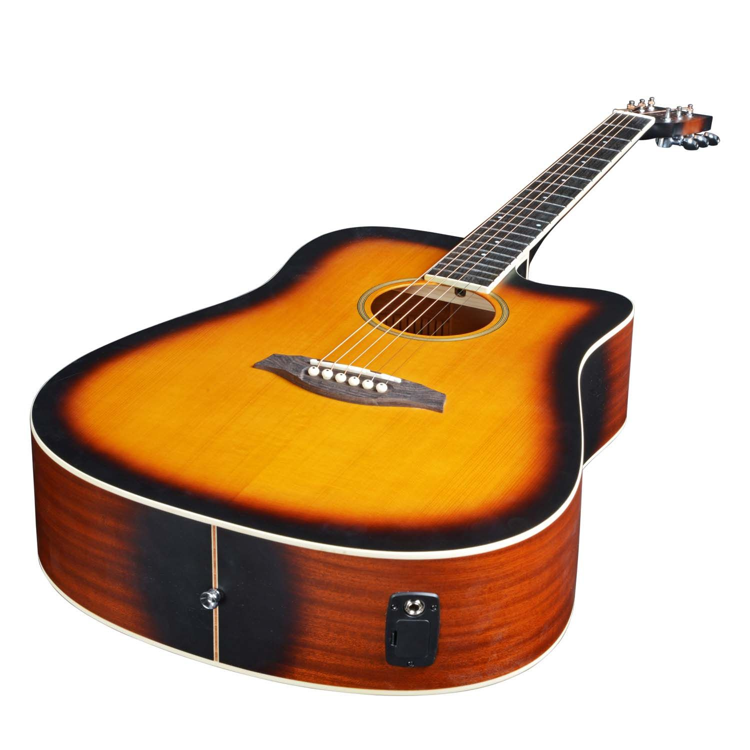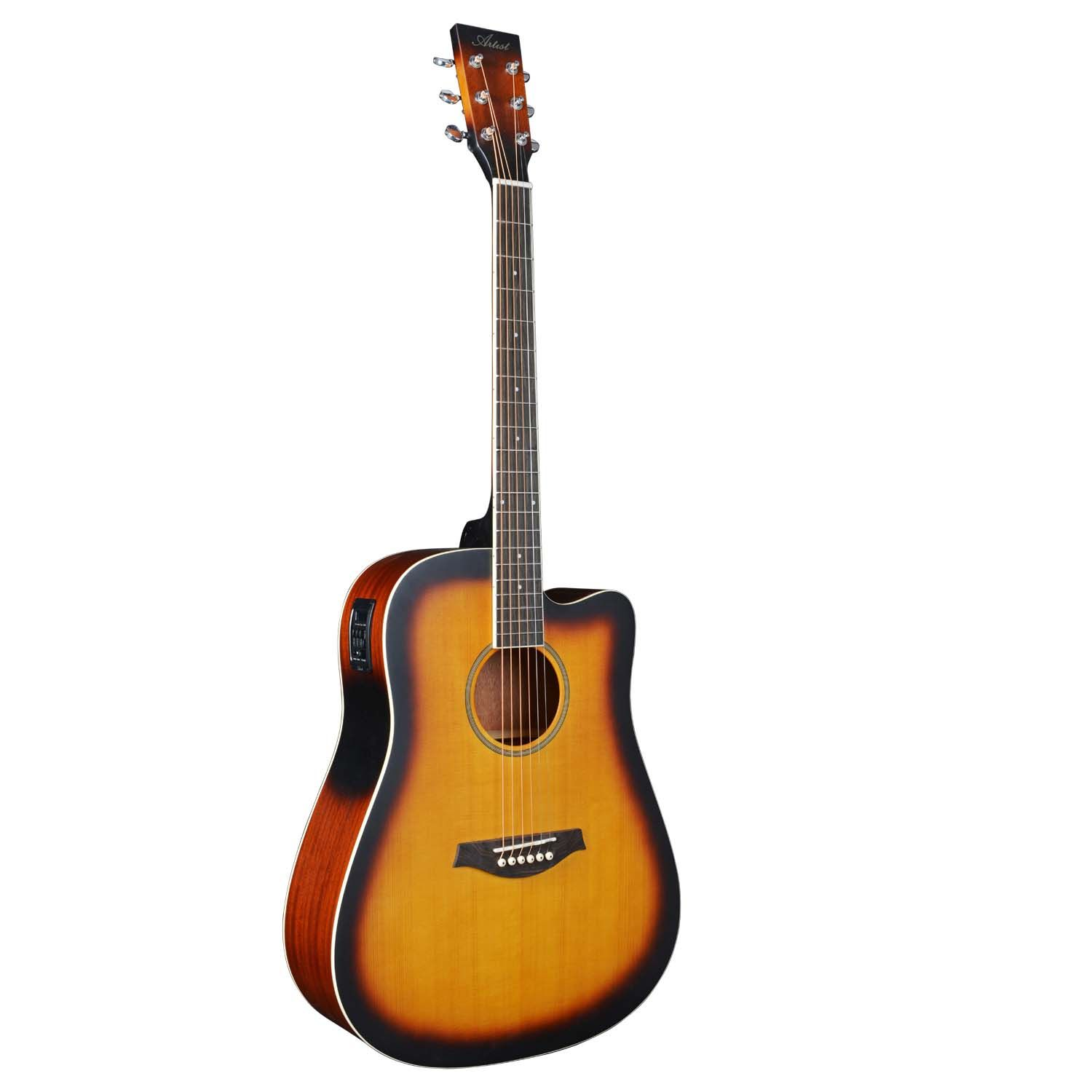 Featuring the Artist BDS50CEQ! The latest Solid Top Acoustic-Electric Guitar in our wide array of affordable and quality guitars. It features a Solid Spruce Top for great tones and a Vintage Sunburst finish for elegance and style. The back and sides of the guitar are made from laminated Sapelle. It also features an Eco-Rosewood Fretboard on an Okumen neck and features a Bone Nut and Saddle for great sustain.