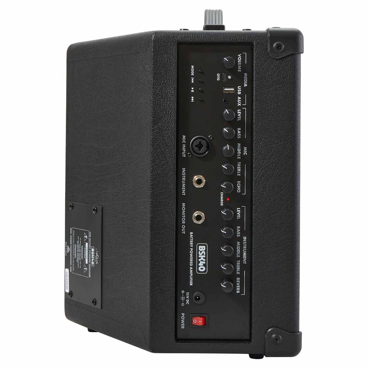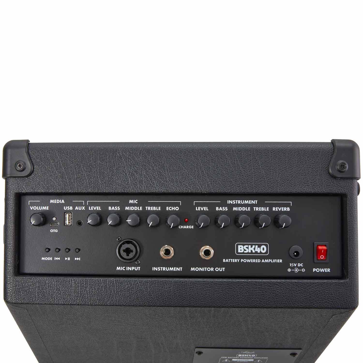 While the two independent channels have been a feature since the BSK20, we've removed some of the visual clutter, opting for a clear and simple layout separating the Mic and Instrument channel. The BSK40's channels each have their own dedicated effects - Echo for the Mic, and Reverb for the Instrument. The new sleek black vinyl face compliments the amp's cover, and the white text makes for better visibility in low-light settings. We've replaced the old pointer knobs for some sturdy control knobs for added stability.