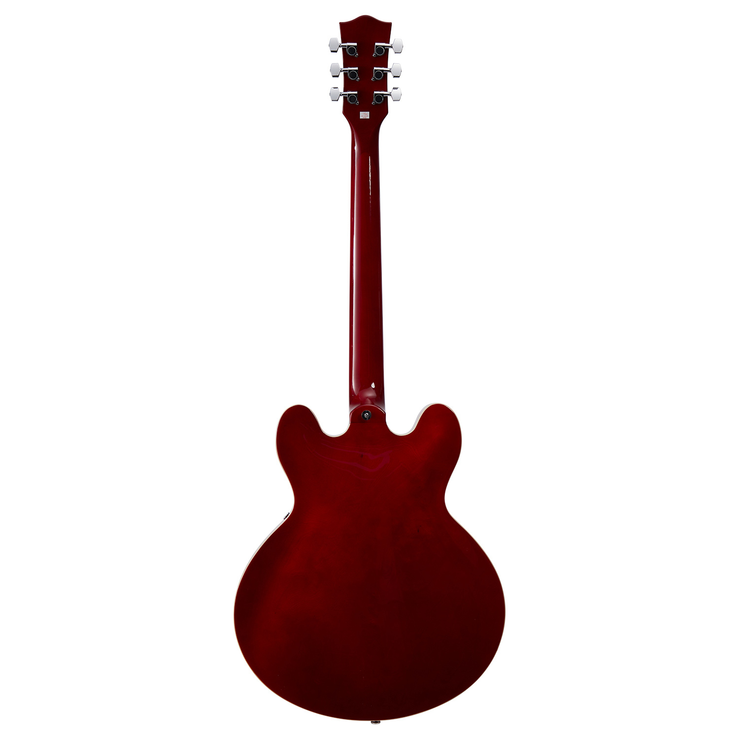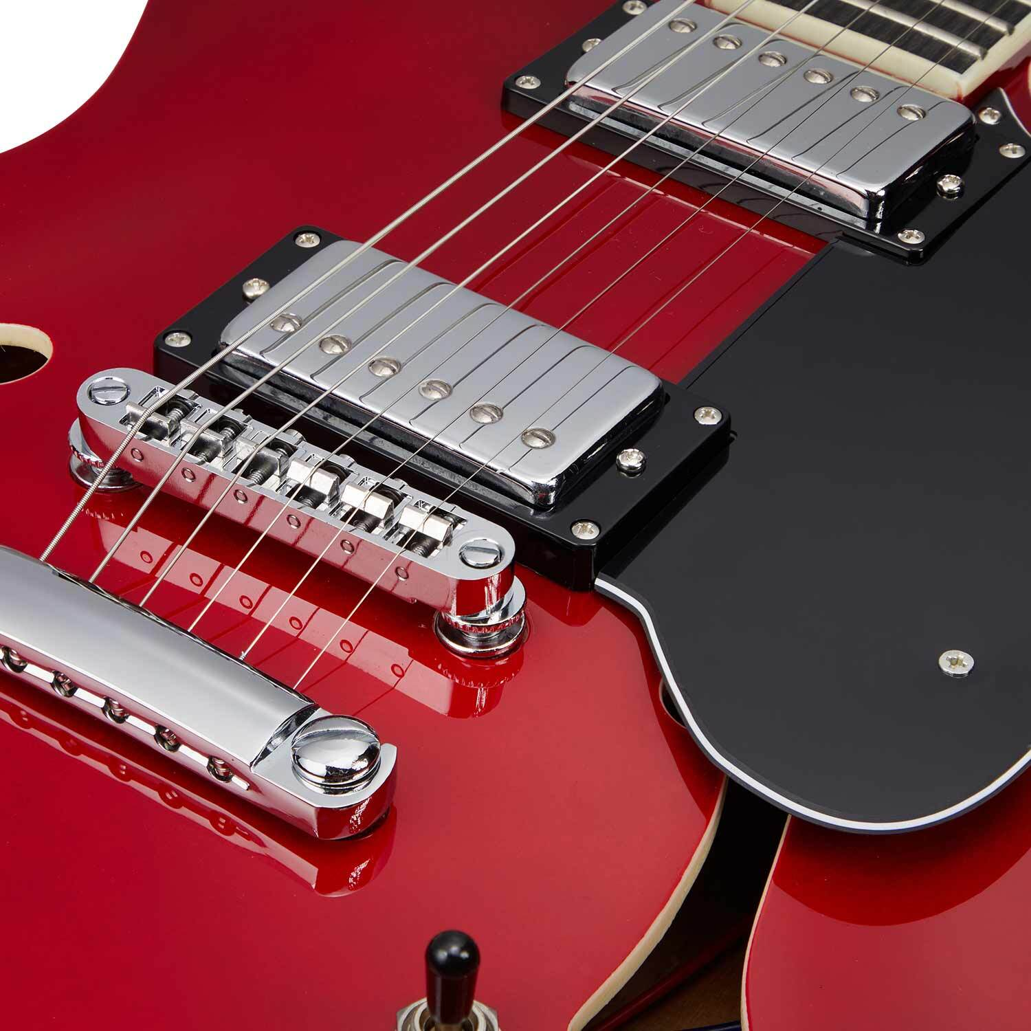 The Artist Cherry58 offers a perfect entry-level guitar for those wishing to begin their journey into the world of blues and Jazz. With the typical set-neck, this guitar is truly a "blues machine". The neck is constructed from maple, with an eco-friendly Eco-Rosewood fretboard. This wood is a fine substitute for rosewood which is now considered a highly endangered species and as a result is rarely available for use in general guitar building these days. The 22 frets show off the 'Dot' shaped plastic inlays and the comfortable "C" shape neck, tune-o-Matic bridge and stop-bar tailpiece means you have a guitar that will not only feel great under your fingers but one that will sustain forever.