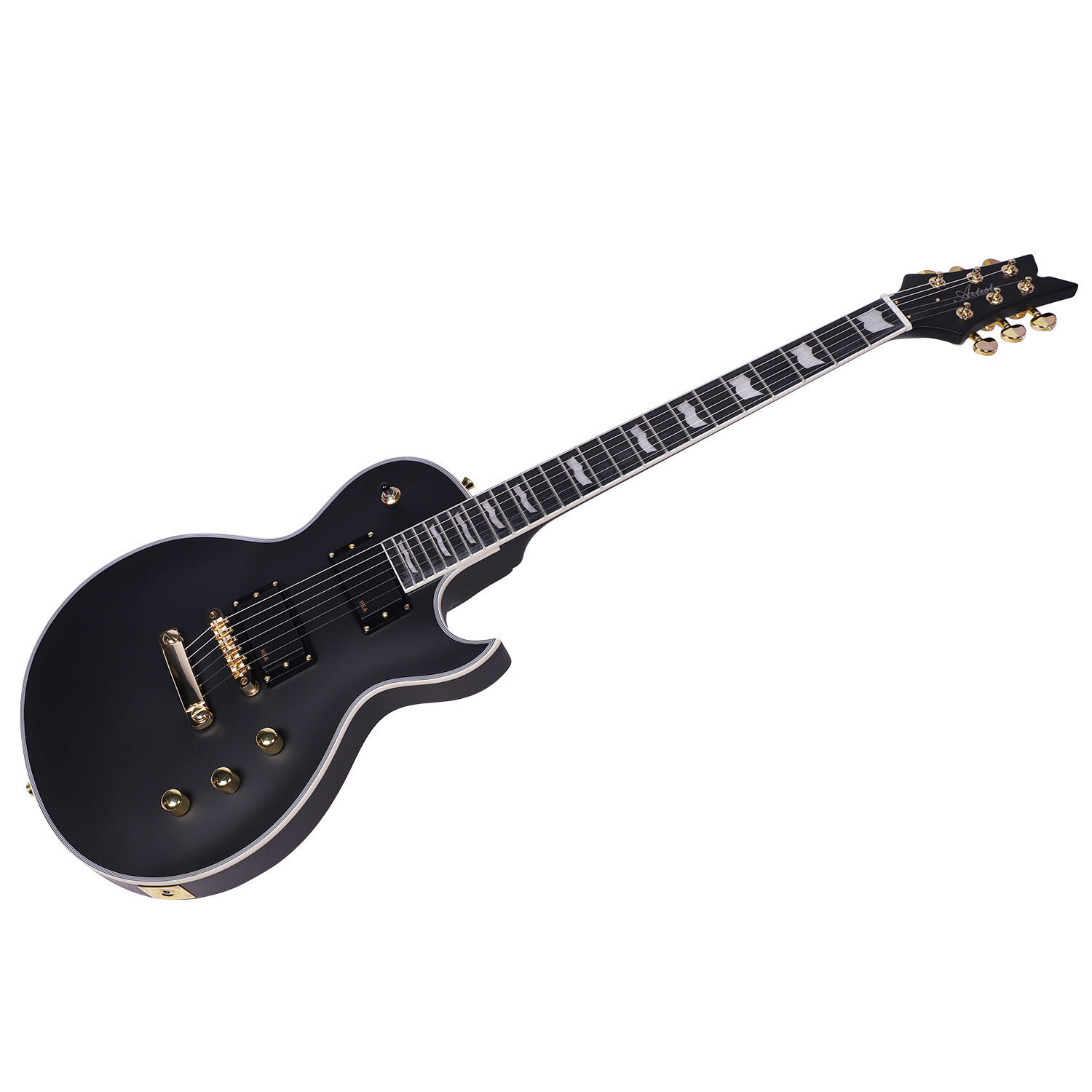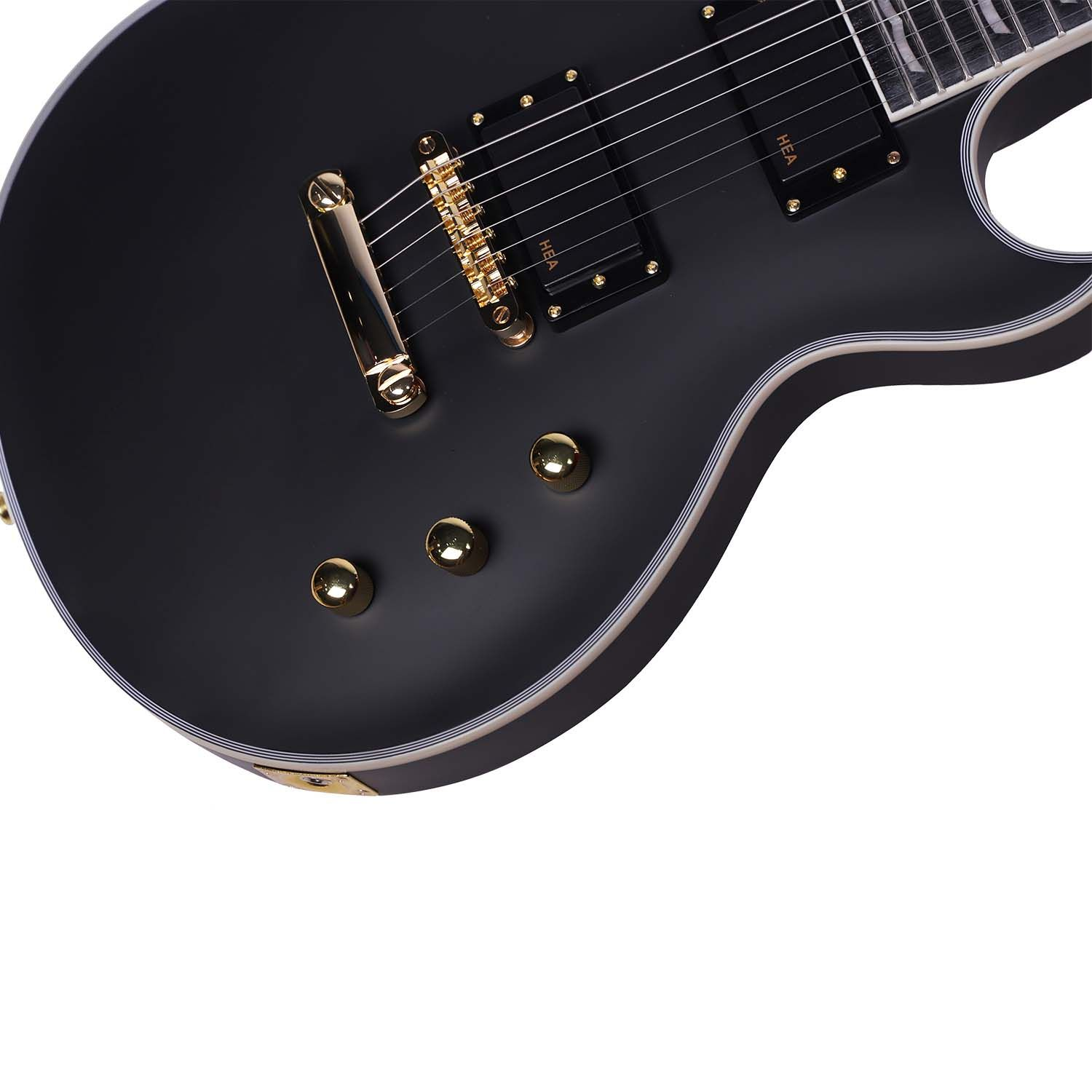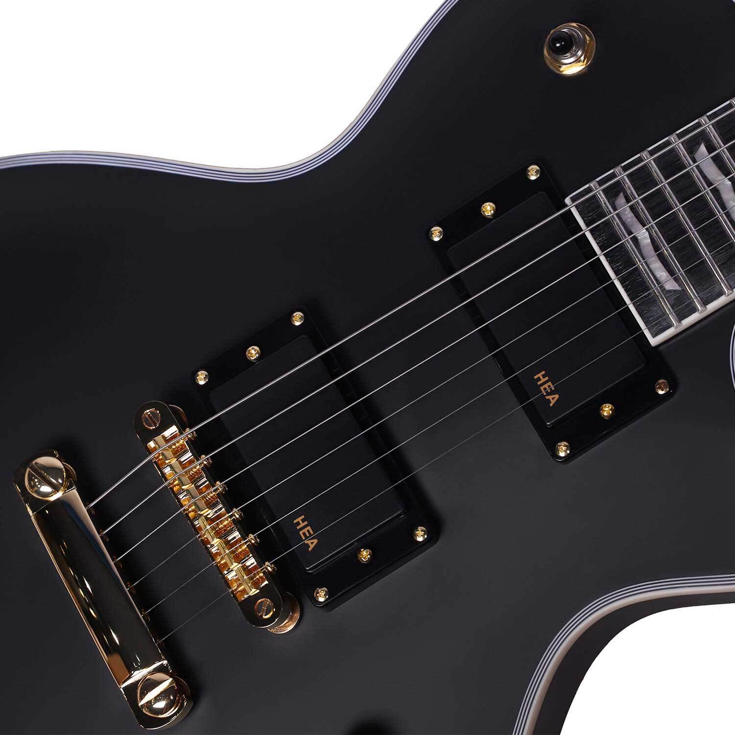 With a Okumen body, matte black finish with a subtle vintage binding around the top, and deep contour on the back that ensures that the guitar sits into your body very comfortably. The active humbucking pickups feature black covers and are secured by gold screws. The gold stop-bar tailpiece and bridge along with the gold volume and tone knobs really add something to the look of this guitar. Not only does this axe play well, it looks great, particularly when you're standing under the lights and about to launch into a blistering solo!