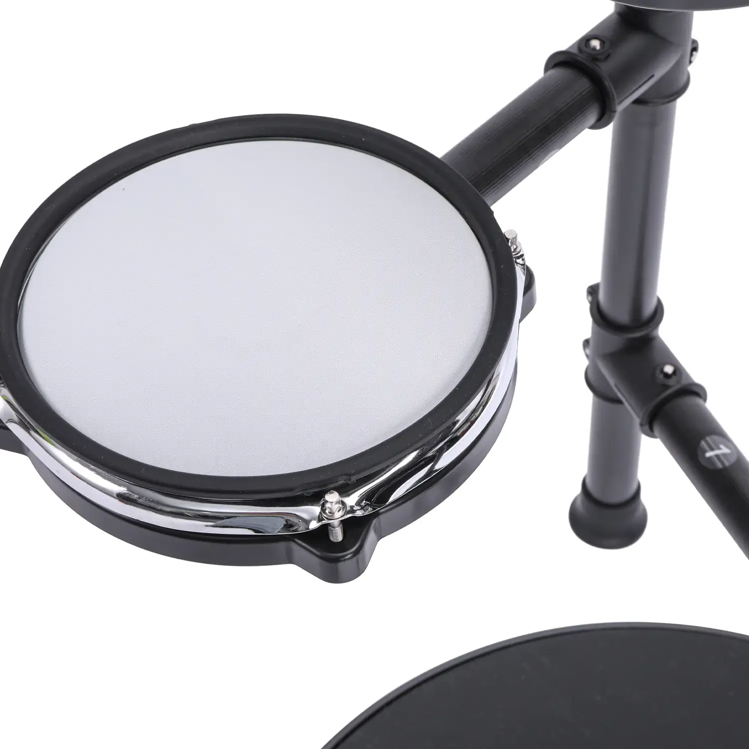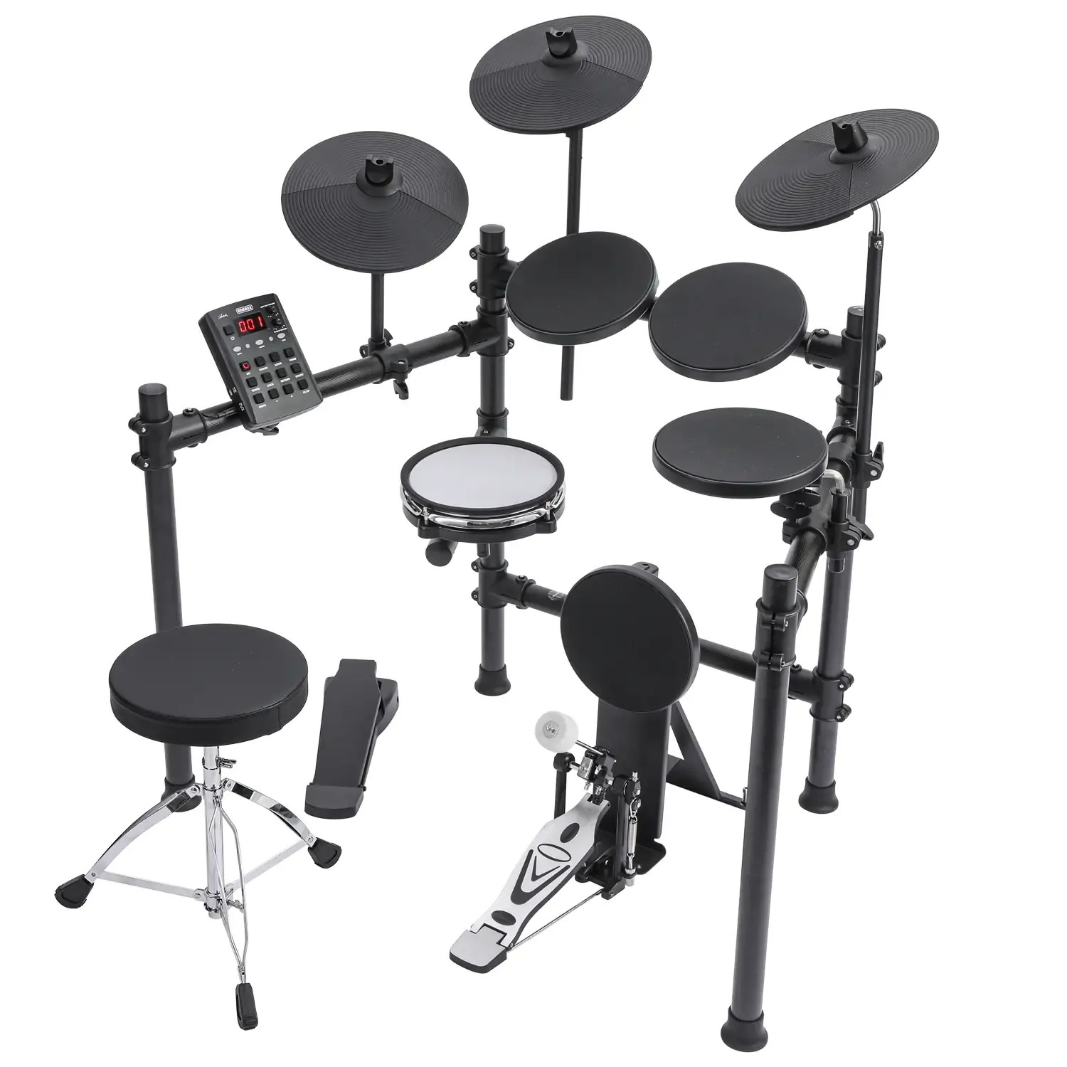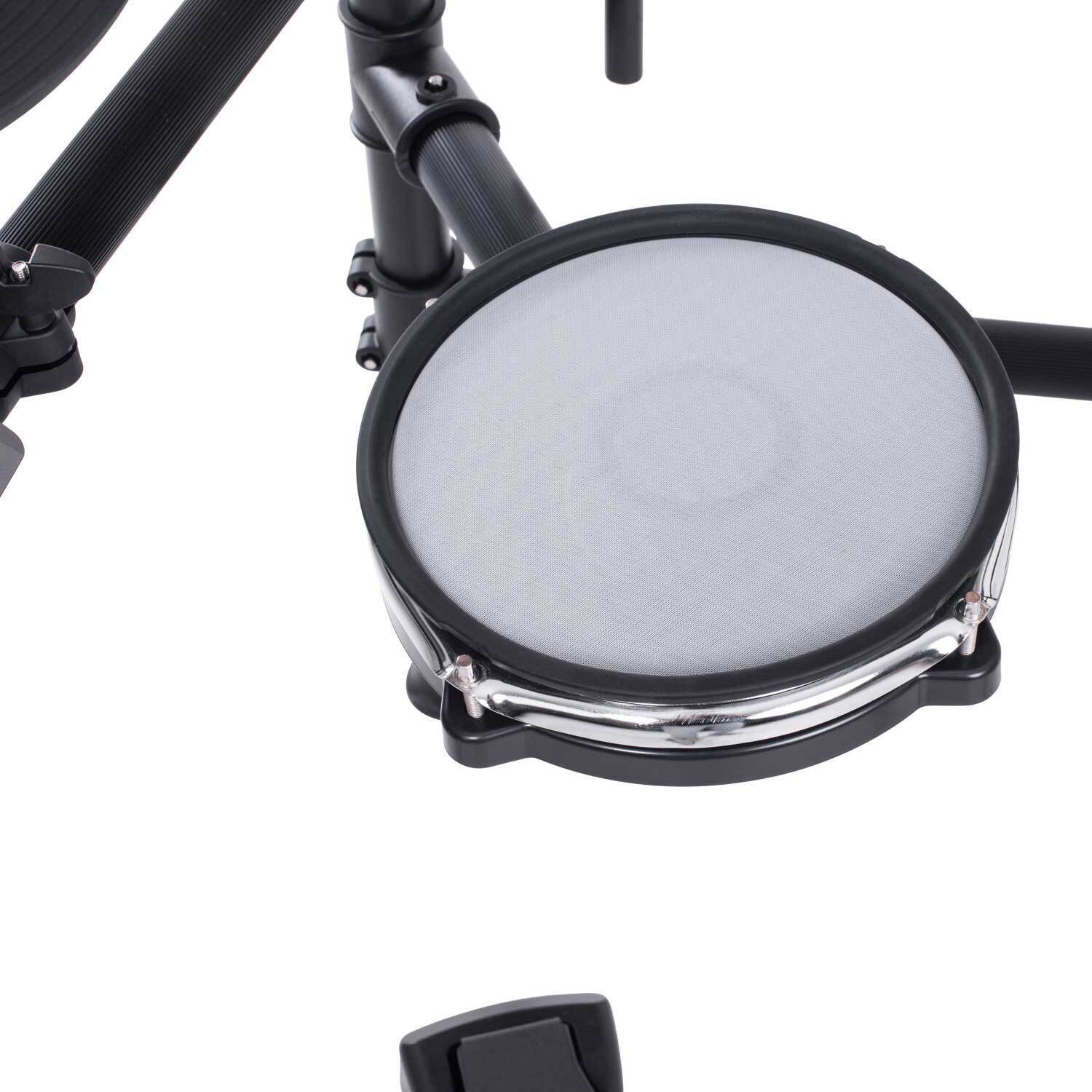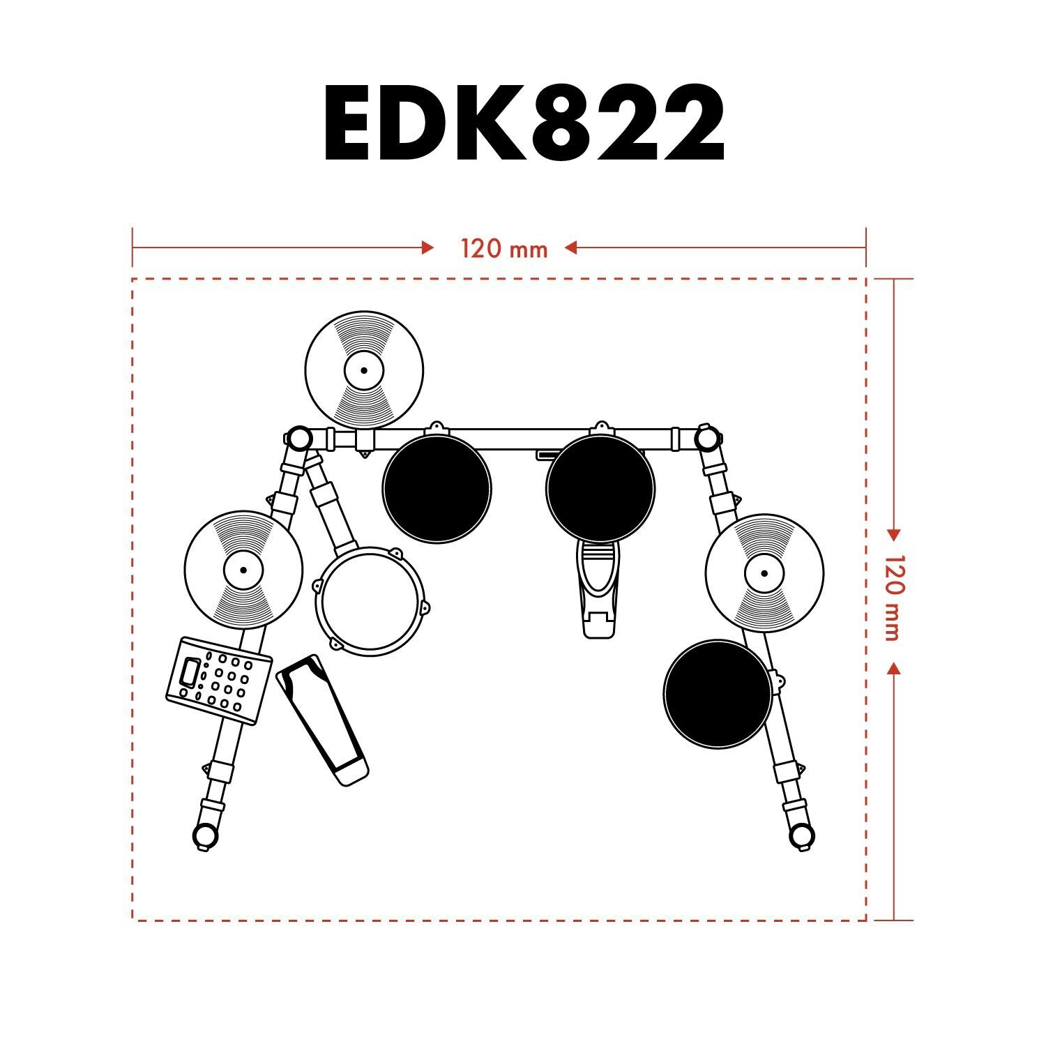 The drumkit features an 8-inch mesh snare pad, an 8-inch kick drum, 3 pieces of 8-inch Tom Pads, and 3 pieces of 10-inch cymbal pads. Each pad can be assigned a specific tone from the 222 sounds loaded in the EDK822's module. The kit also features a rim trigger for the snare and a choke function for both the crash and ride cymbals.