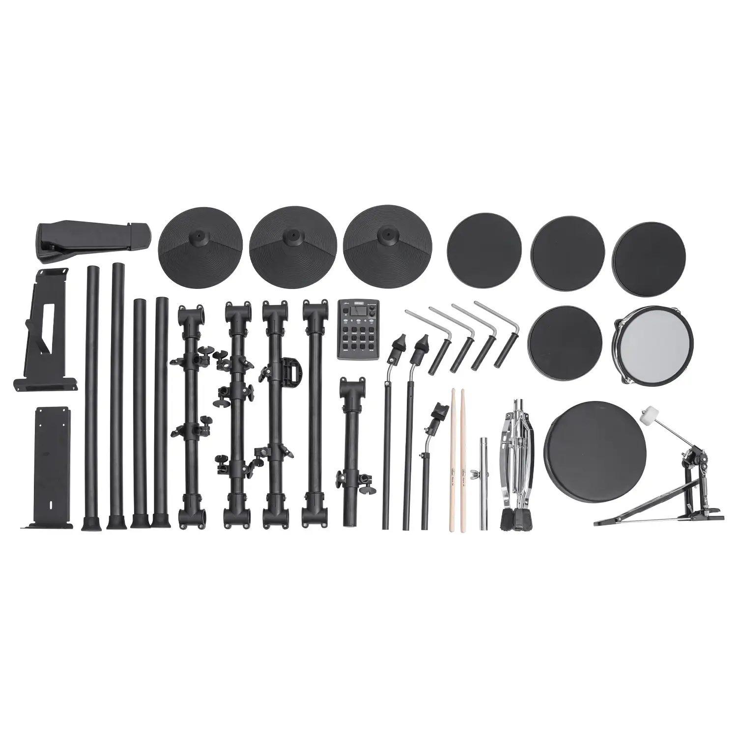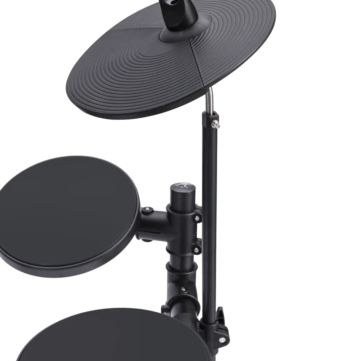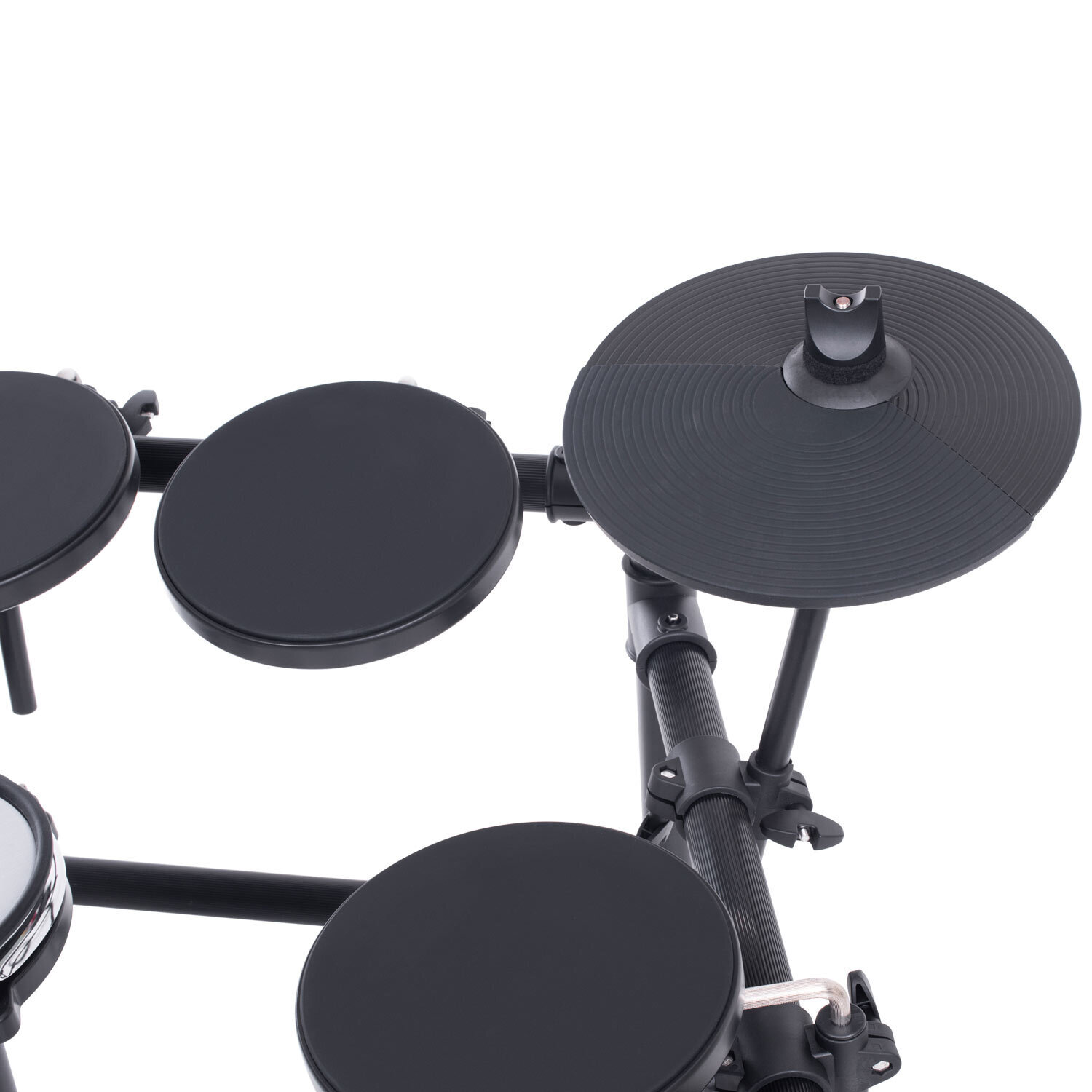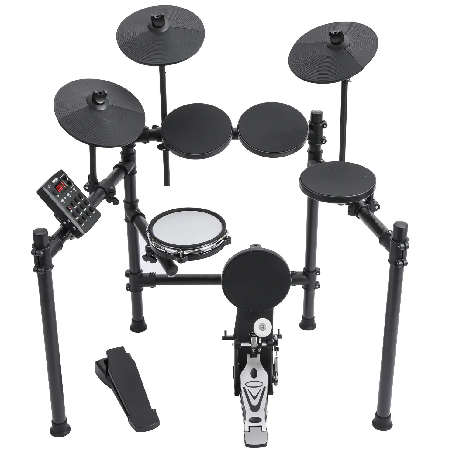 The drumkit features an 8-inch mesh snare pad, an 8-inch kick drum, 3 pieces of 8-inch Tom Pads, and 3 pieces of 10-inch cymbal pads. Each pad can be assigned a specific tone from the 222 sounds loaded in the EDK822's module. The kit also features a rim trigger for the snare and a choke function for both the crash and ride cymbals.