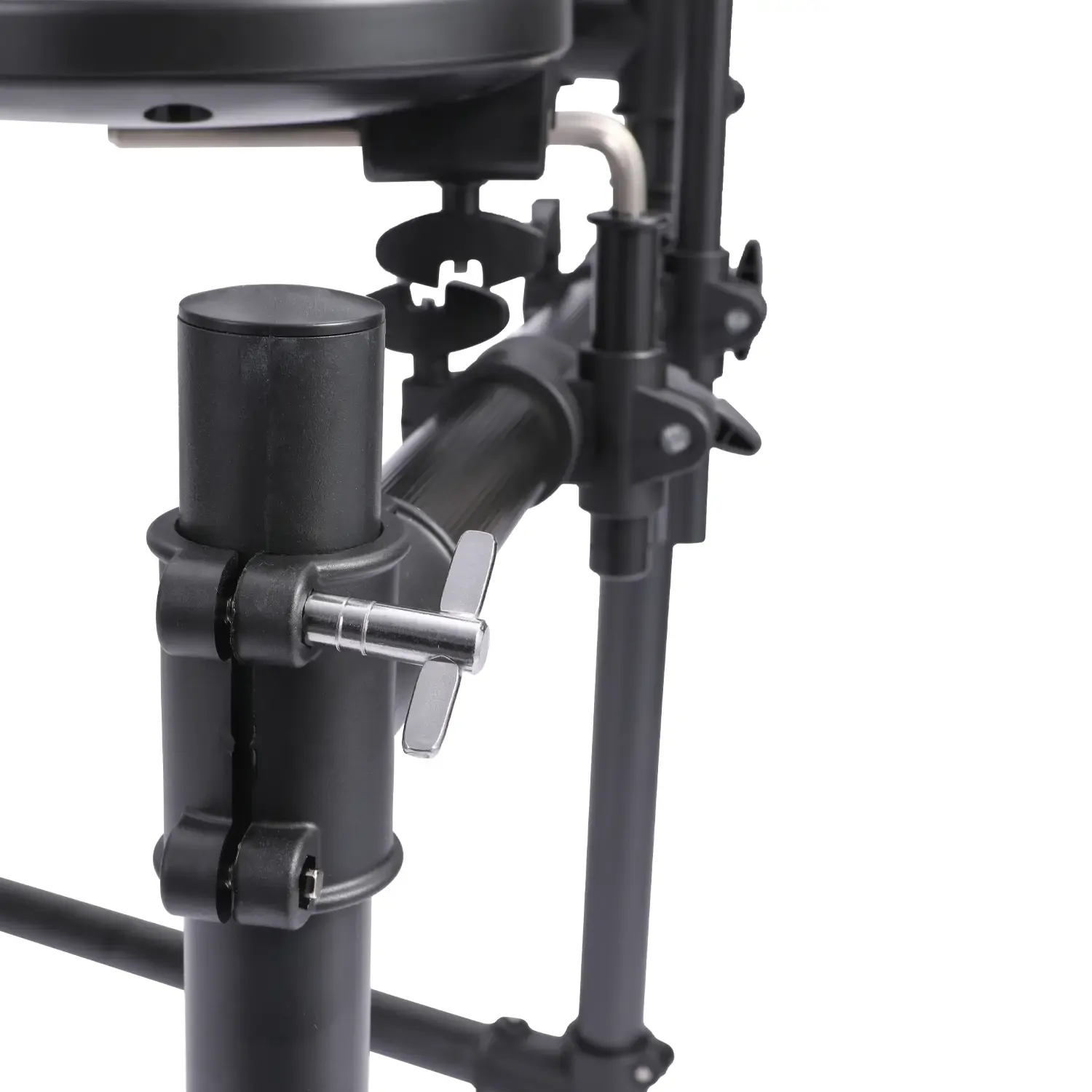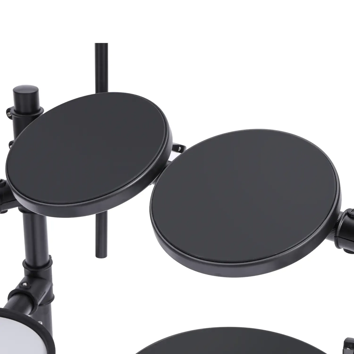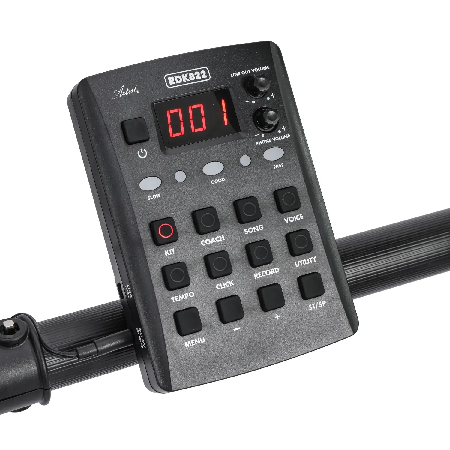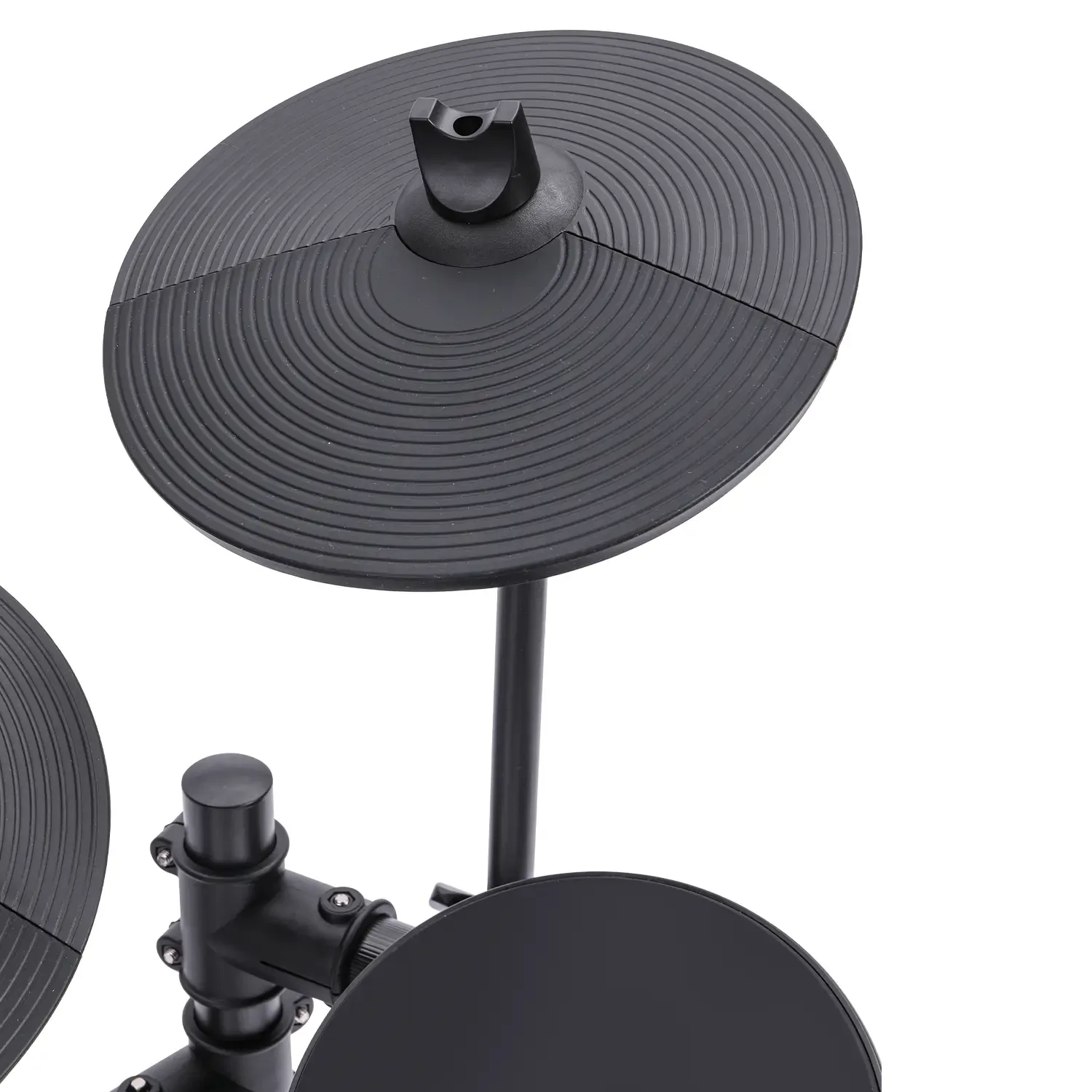 The drumkit features an 8-inch mesh snare pad, an 8-inch kick drum, 3 pieces of 8-inch Tom Pads, and 3 pieces of 10-inch cymbal pads. Each pad can be assigned a specific tone from the 222 sounds loaded in the EDK822's module. The kit also features a rim trigger for the snare and a choke function for both the crash and ride cymbals.