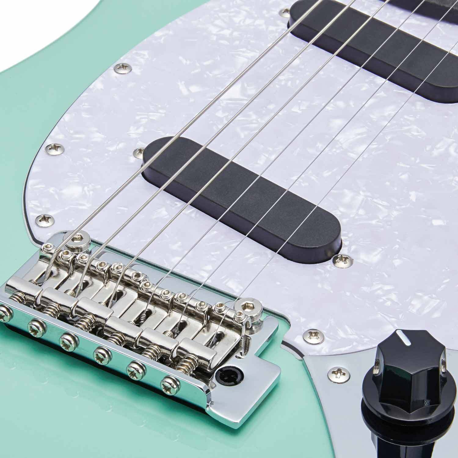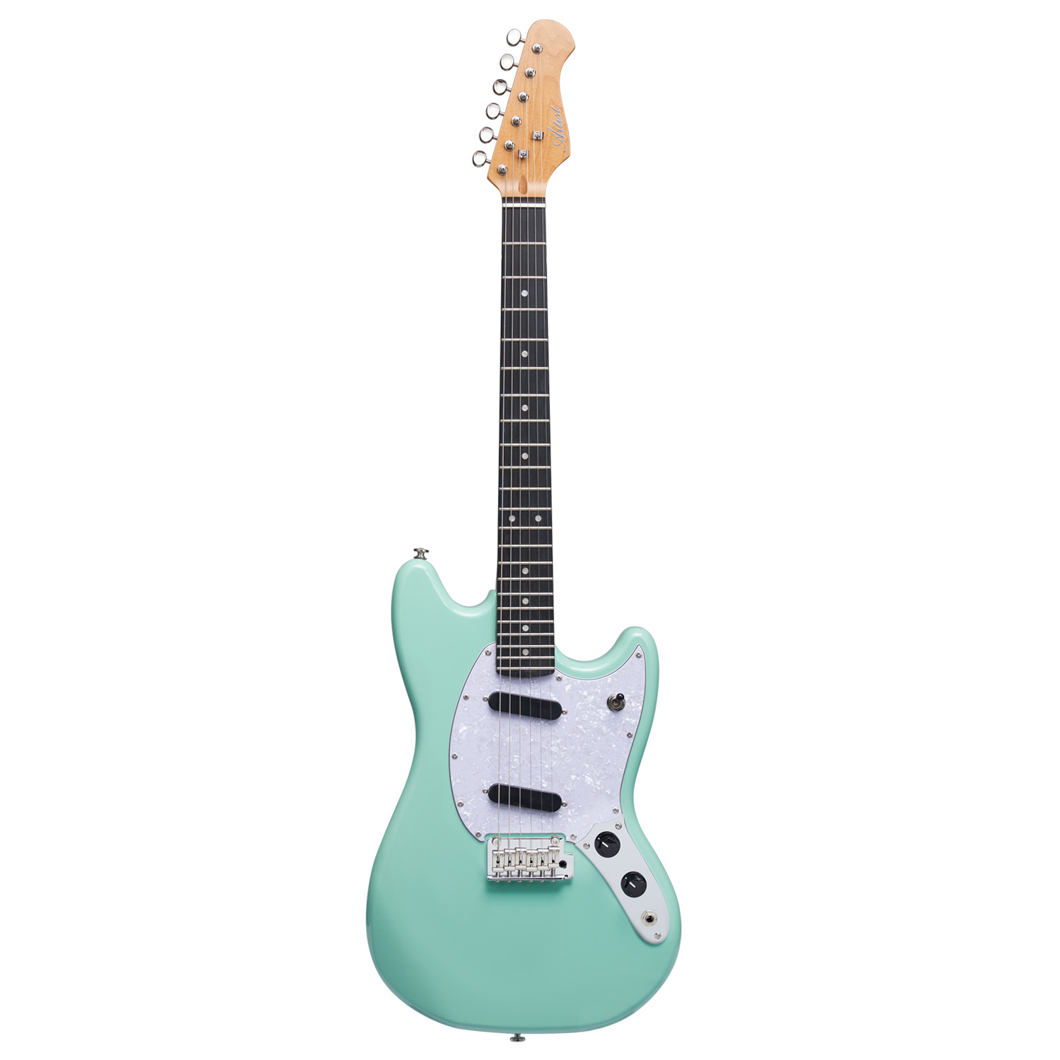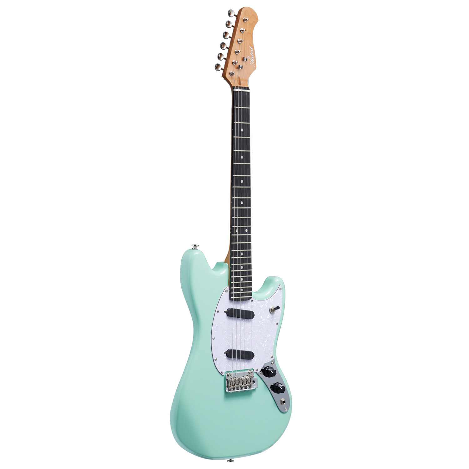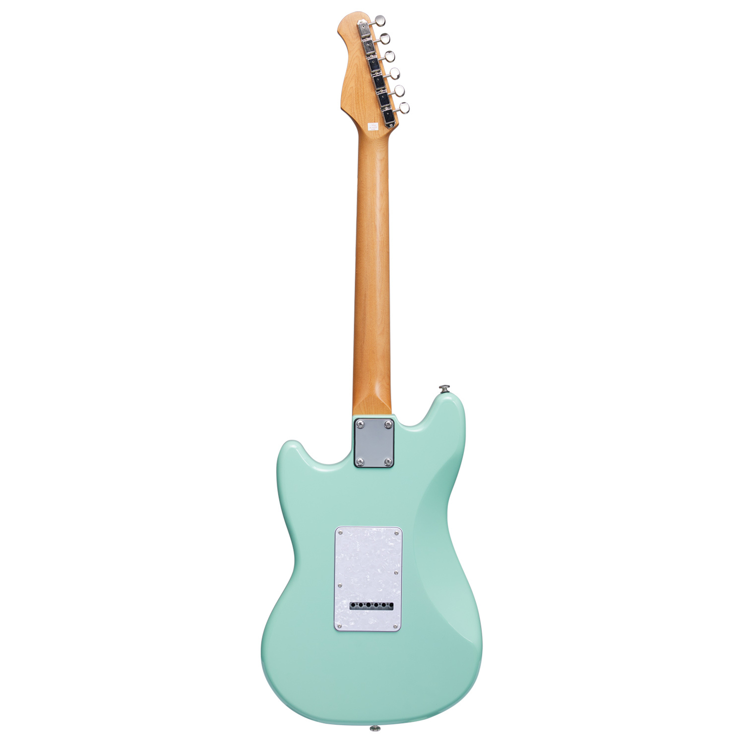With a solid Poplar body, the Falcon features a Vintage Green finish. With a nod to other vintage-style short-scales, this double-cutaway body is small and lightweight, with a simple bolt-on Maple neck, 22 Medium Frets and an Eco-Rosewood Fretboard. Being a short-scale guitar, the Falcon has a 42mm Bone nut and a 9.5" fingerboard radius, with a 24” Scale Length. You can use standard length strings for this guitar, and experimenting with different gauges can yield some awesome results with bends and the trem bar!