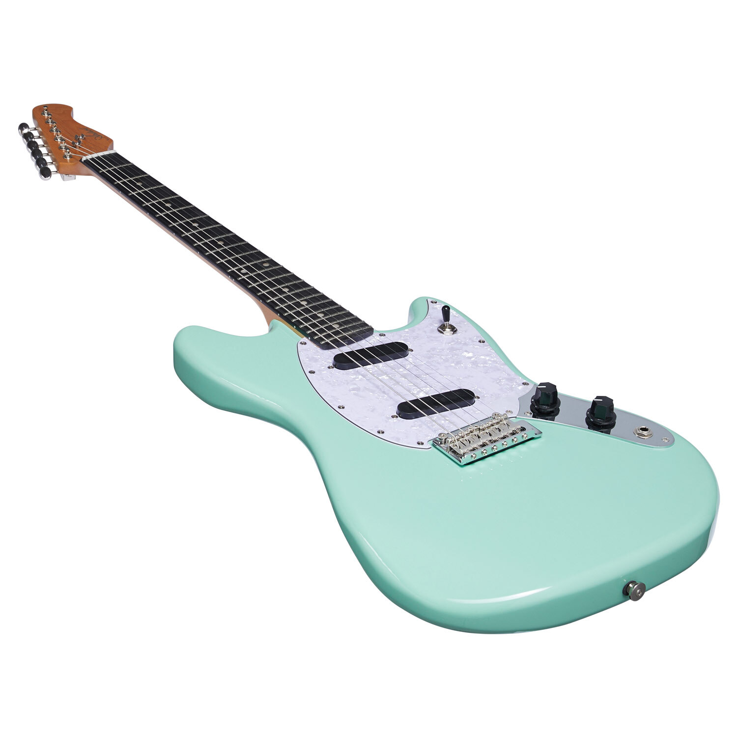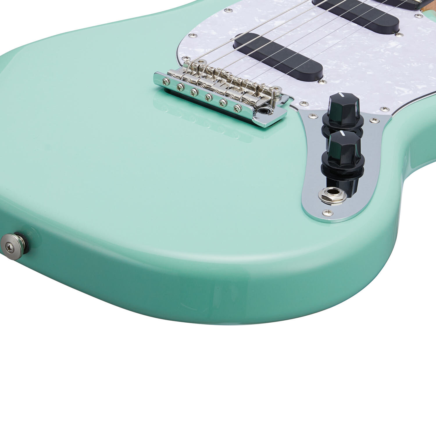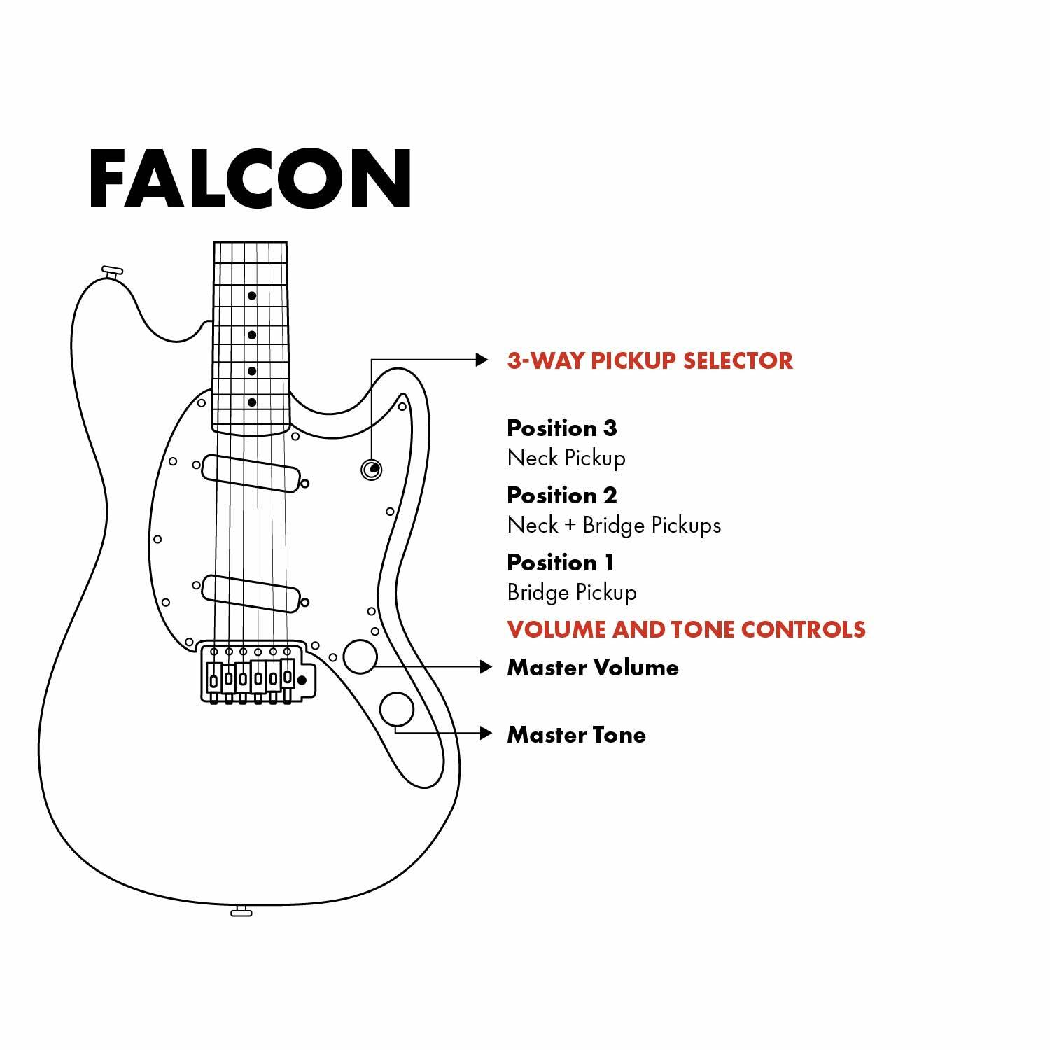 With a solid Poplar body, the Falcon features a Vintage Green finish. With a nod to other vintage-style short-scales, this double-cutaway body is small and lightweight, with a simple bolt-on Maple neck, 22 Medium Frets and an Eco-Rosewood Fretboard. Being a short-scale guitar, the Falcon has a 42mm Bone nut and a 9.5" fingerboard radius, with a 24” Scale Length. You can use standard length strings for this guitar, and experimenting with different gauges can yield some awesome results with bends and the trem bar!