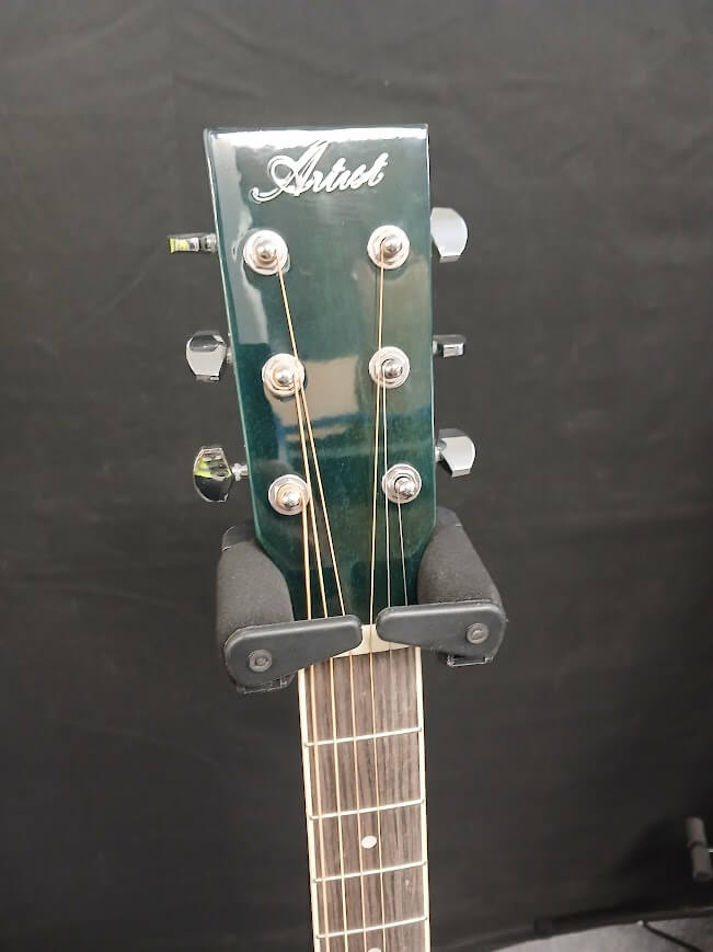 It has a Low String Action (all our guitars are set-up at the factory for the optimum beginner playing level). String action is the measurement from the top of the 12th fret to the bottom of the string. This is very important because a guitar with a high action is hard to play, a guitar with too low an action will buzz and sound bad. Artist Guitars are set up at the factory for the optimum level for a beginner.