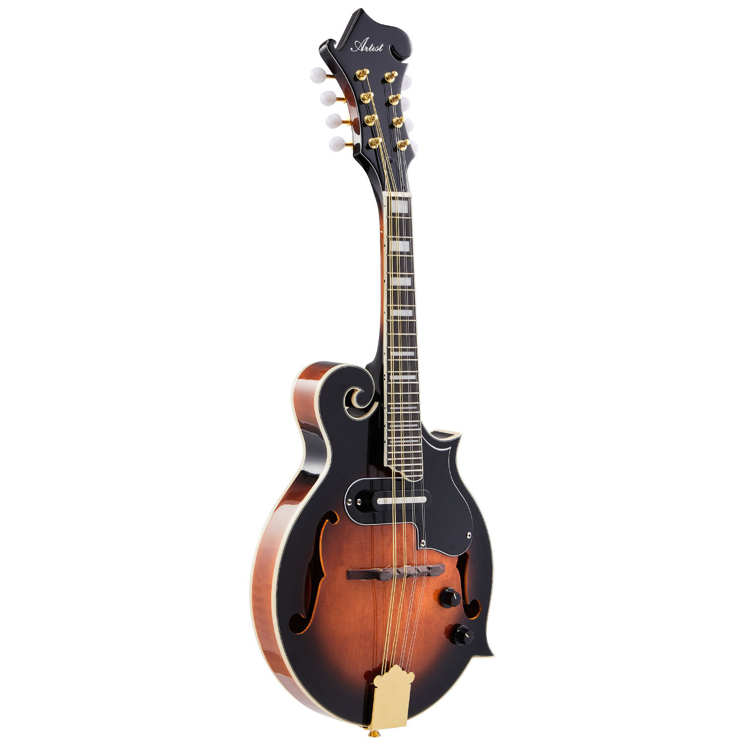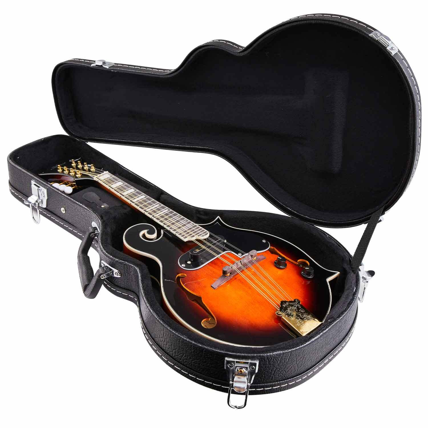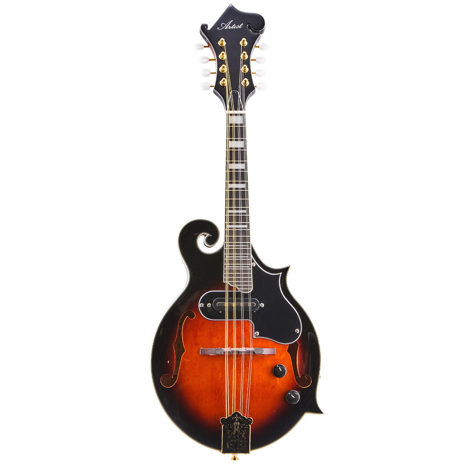 The MDF100EQ is the latest and greatest Mandolin in the Artist range! This premium F-Style Mandolin features a solid A-grade spruce top with flame maple back and sides. With a European maple one-piece neck for improved sustain and a Purple Heart fretboard, every inch of the MDF100EQ is designed with looks and durability at the front of mind. The inbuilt pickup and EQ allow you to plug into an amp and speakers and shape your tone to your heart's content. From the gold-plated machine heads to the golden tailpiece, every inch of the MDF100 is ornately crafted and once picked up, is nearly impossible to put down. For the discerning mandolinist looking to be heard over the crowd, this will be a hard one to pass up.