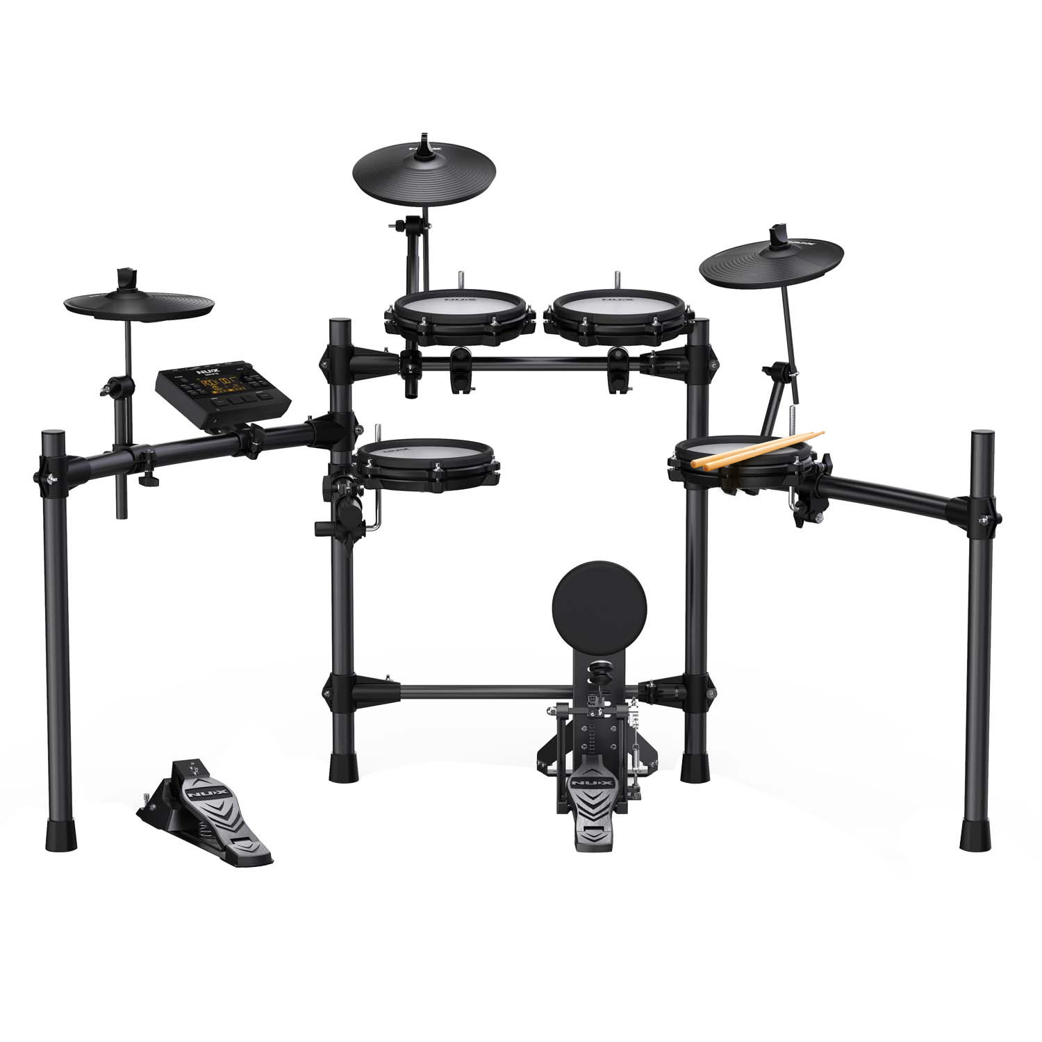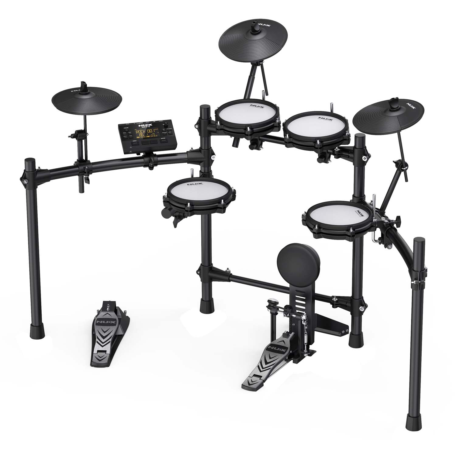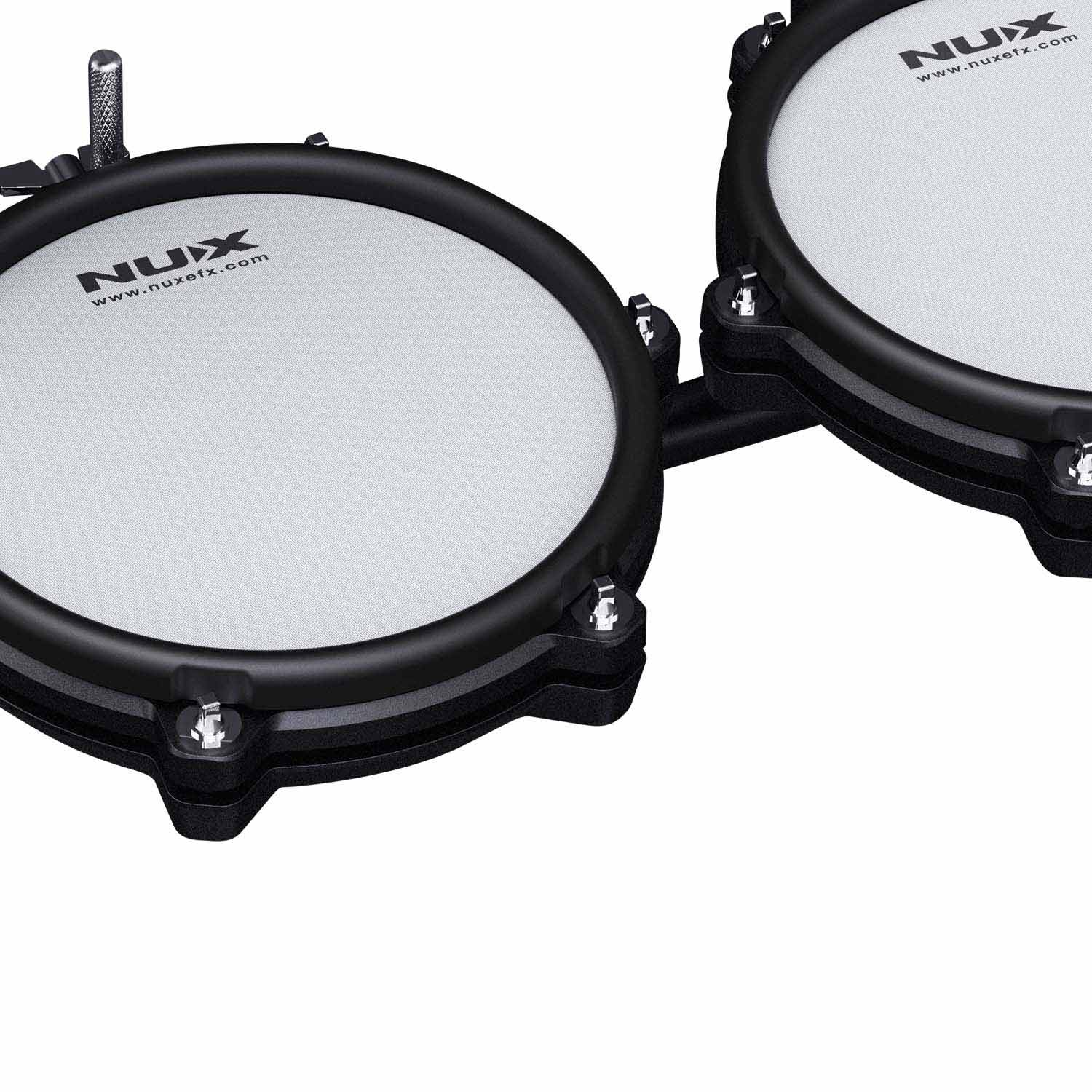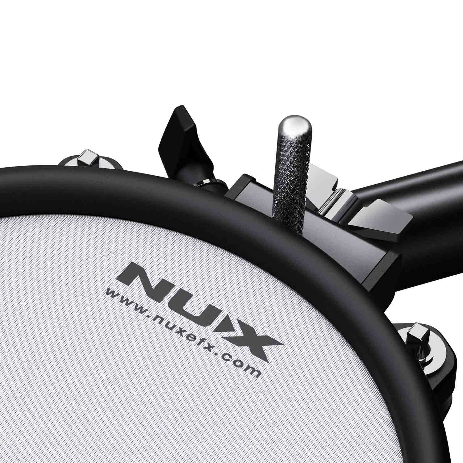 The Nux DM210 is an adjustable and compact electronic drumkit featuring all mesh heads. The Snare and Tom pads feature a dual trigger system allowing for rim shots, while the Cymbal Pads feature a choke function, all of which can be adjusted with the easy-to-use module!