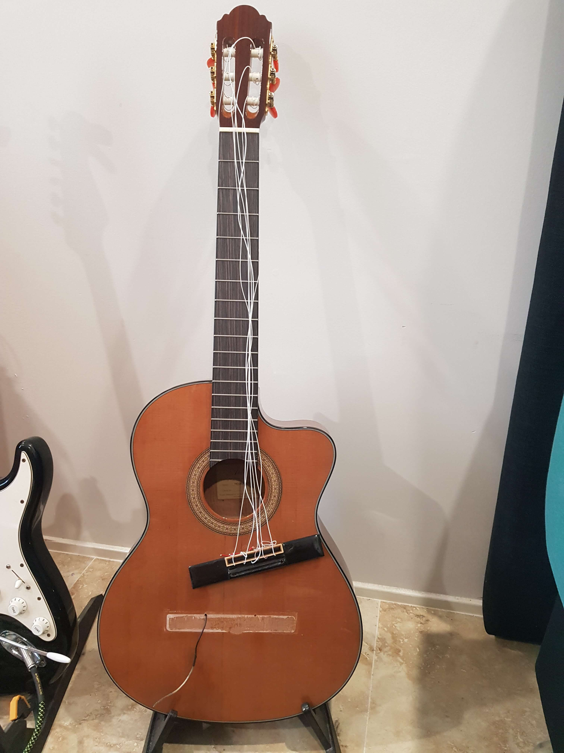 This is one of my personal favourites. The solid cedar top gives it a really warm sound and we have added a Spanish heel. For those of you that don't know, the Spanish heel is a much more difficult way of making a guitar but it greatly improves the sustain. On standard Classical guitars they often use dowels to attach the neck and a lot of tone can be lost through this joint.