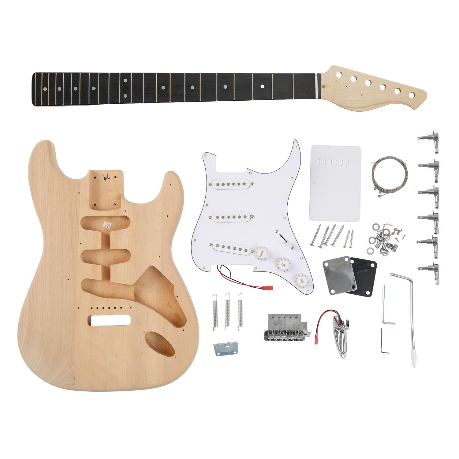 The kit includes a ready-to-spray unbound bolt-on-neck, an unfinished body, three single-coil ceramic pickups loaded onto a white scratchplate, three pots, white coloured knobs, chrome-plated tremolo bridge, and strings.
