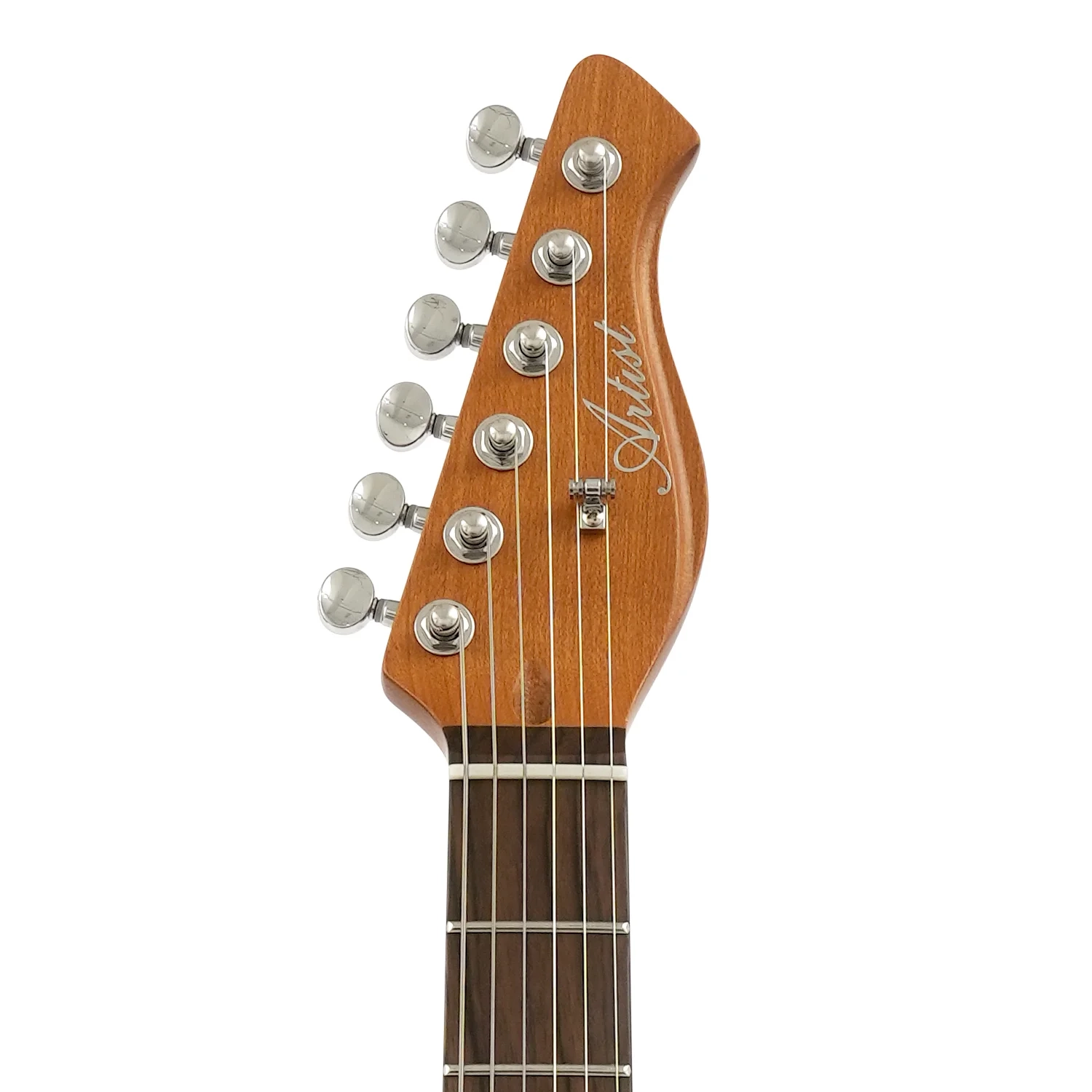 The Artist AT53 pairs the best elements of vintage guitar design with modern features to bring you an instrument that straddles the line between innately familiar and excitingly new. With a classic-looking roasted maple neck finished with a comfortable satin feel, the high-grade locking tuners and rosewood fretboard (at a lightning-quick 14-inch radius), make for a guitar that belies its own old-world aesthetic. With its stunning nitrocellulose finish, a material used mainly on guitars crafted prior to the 1970s, the AT53 sustains amazingly for such a lightweight instrument!