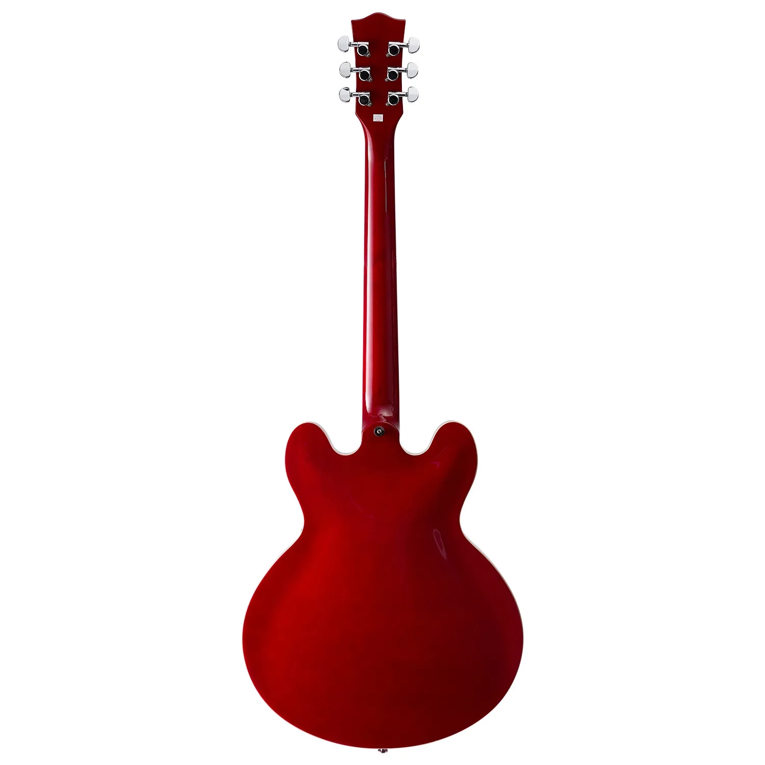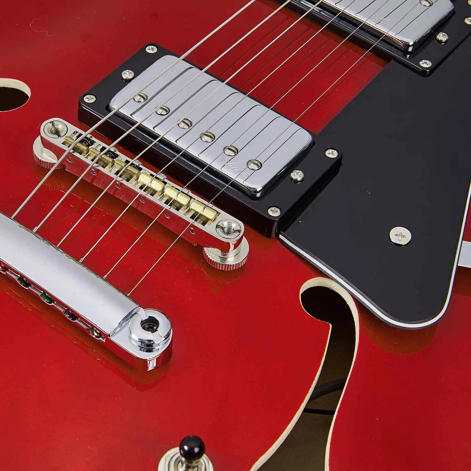 The body features a stunning bound basswood top finished in gorgeous ruby red, evoking pure vintage mojo. With 22 frets along an ultra-stable, 12" radiused Ebony fretboard, and an immediately familiar "C"-shaped neck profile, there's enough beef under the hands for those who prefer a more vintage feeling neck, without the chunk of the 'baseball bat' necks of old. With set-neck construction, the Cherry58DLX provides excellent sustain and resonance, making it an ideal instrument for blues, jazz, and rock players looking for rich, expressive tones.