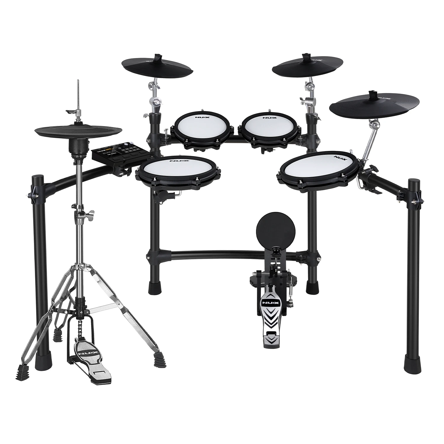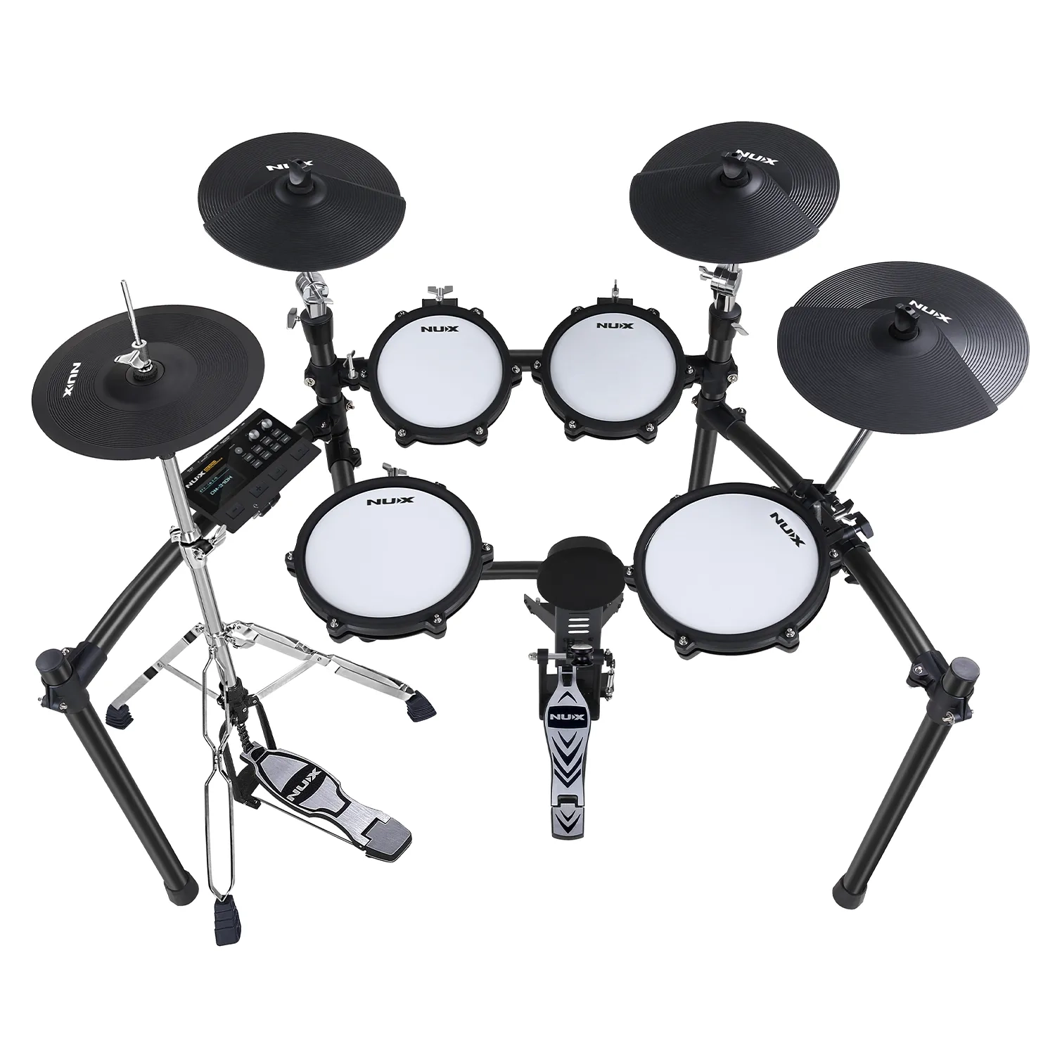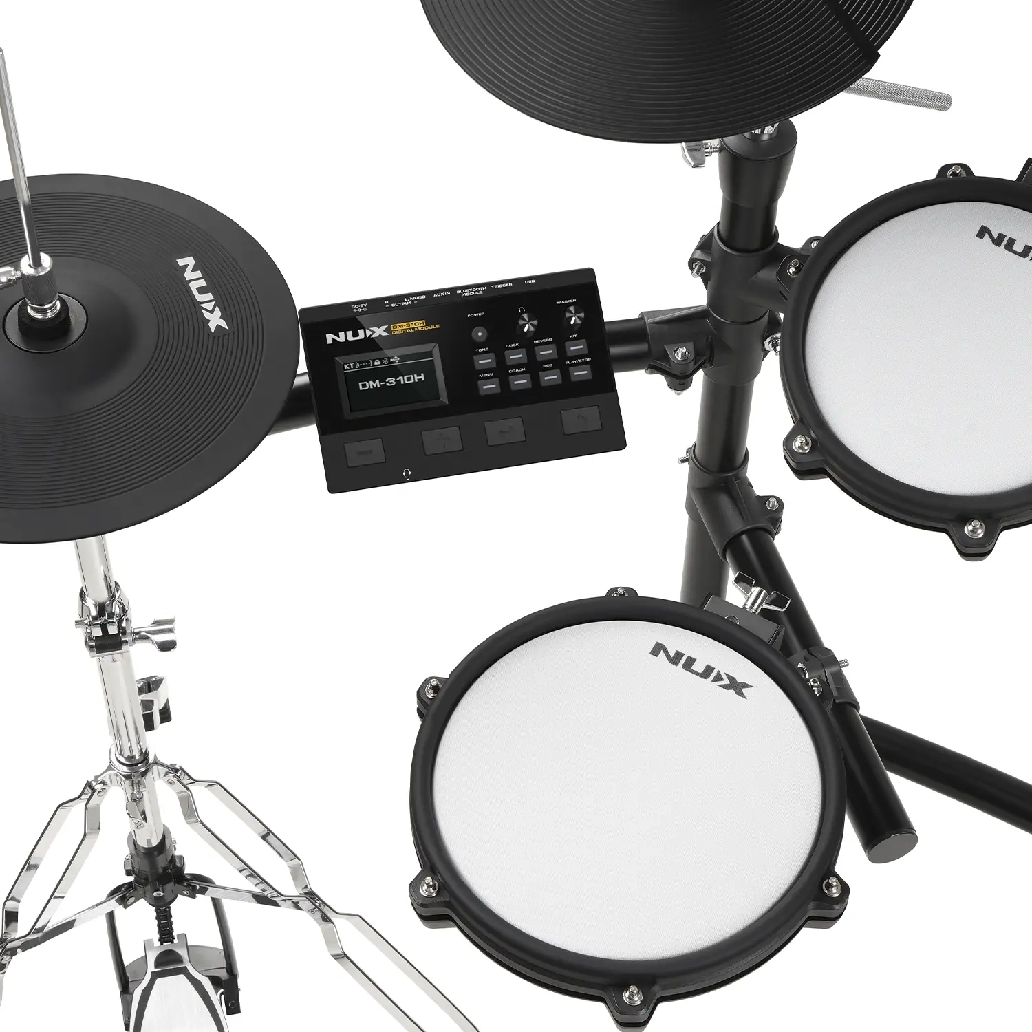 The NUX DM310H is a professional-grade electronic drum set designed for drummers seeking a natural, responsive playing experience. Featuring an independent hi-hat and larger ride, snare, and floor tom pads, it offers improved ergonomics and stage presence, allowing every strike to feel smooth and expressive.