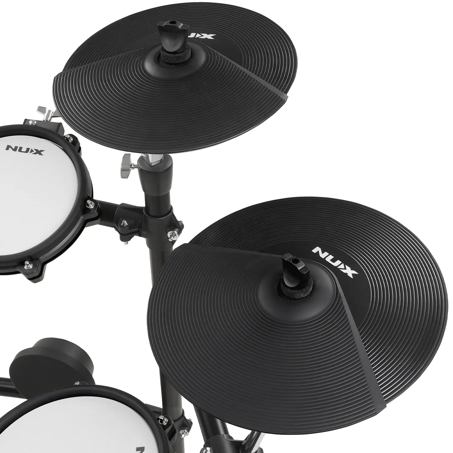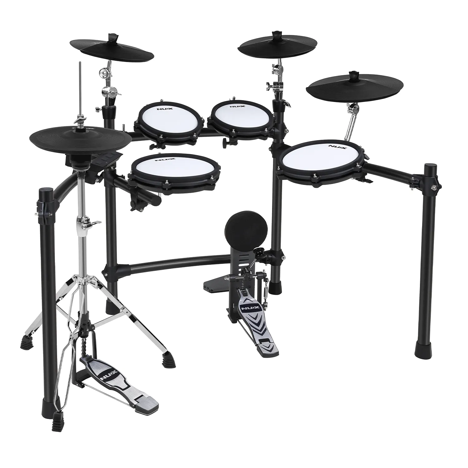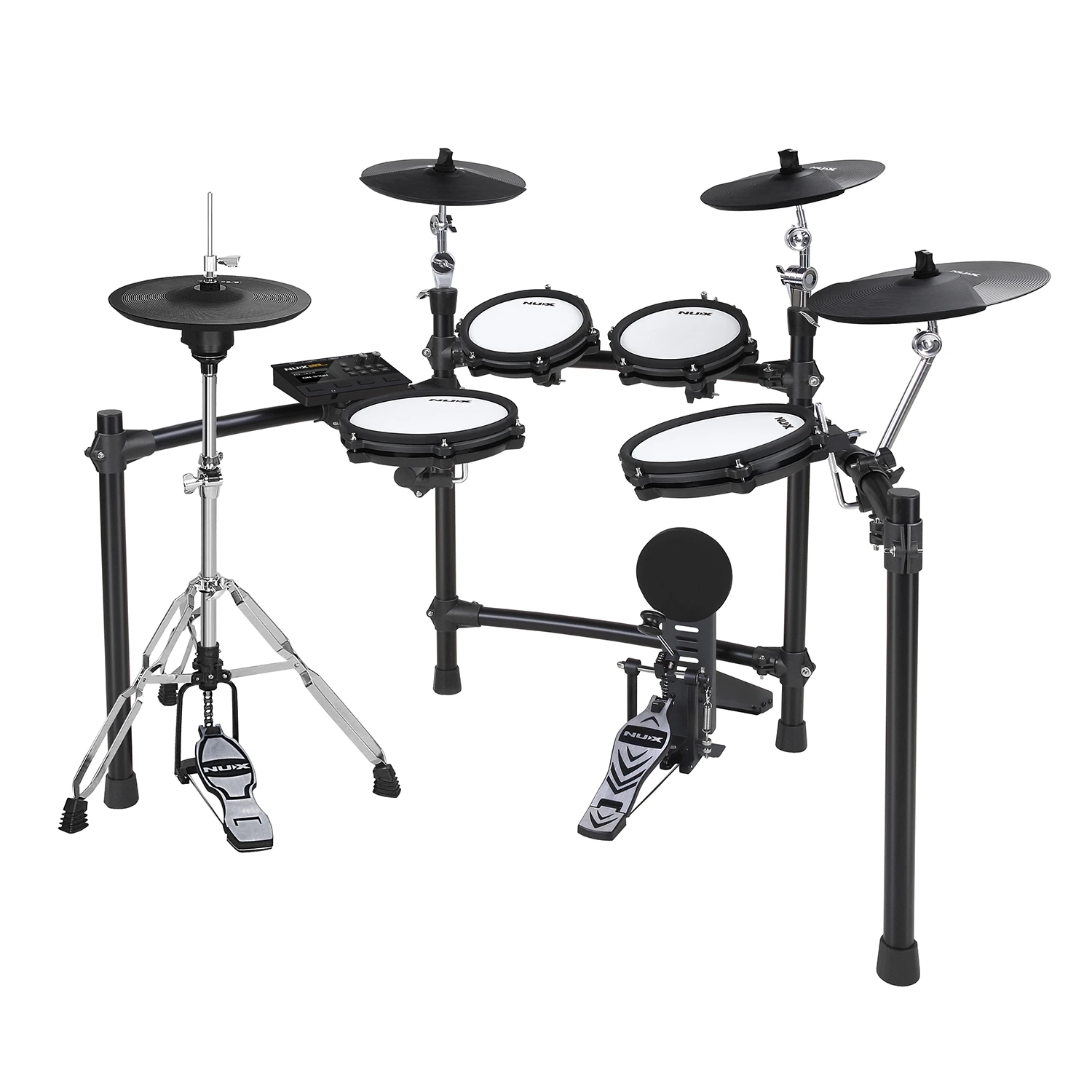 The NUX DM310H is a professional-grade electronic drum set designed for drummers seeking a natural, responsive playing experience. Featuring an independent hi-hat and larger ride, snare, and floor tom pads, it offers improved ergonomics and stage presence, allowing every strike to feel smooth and expressive.