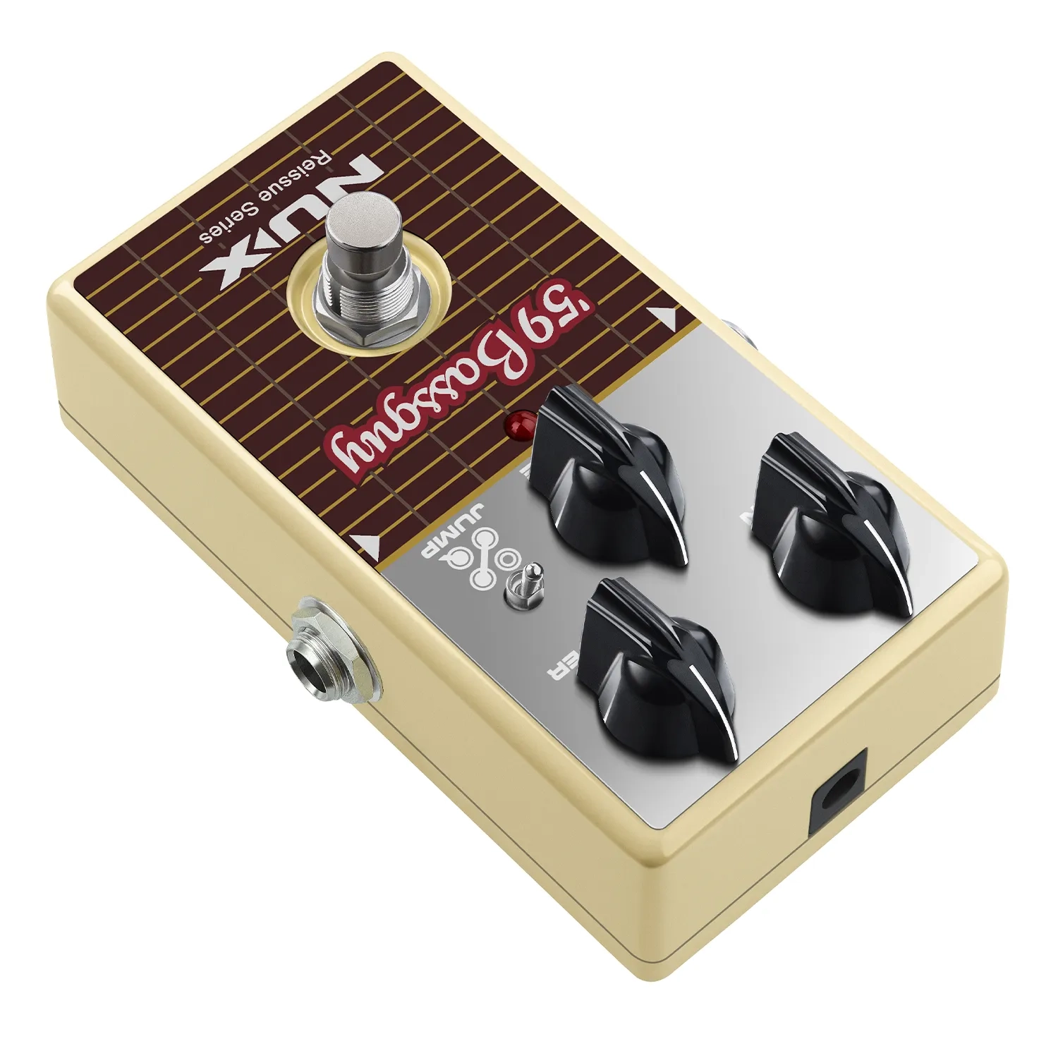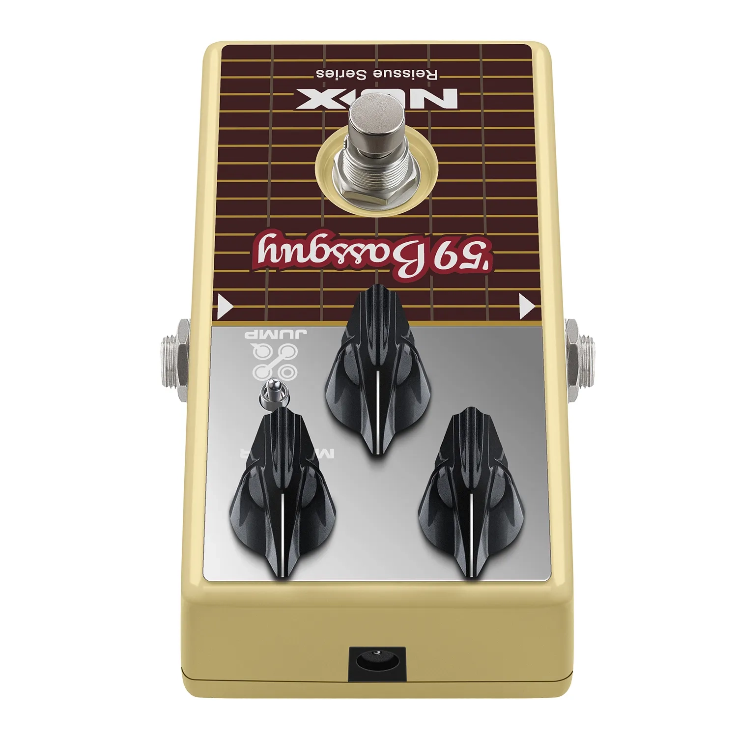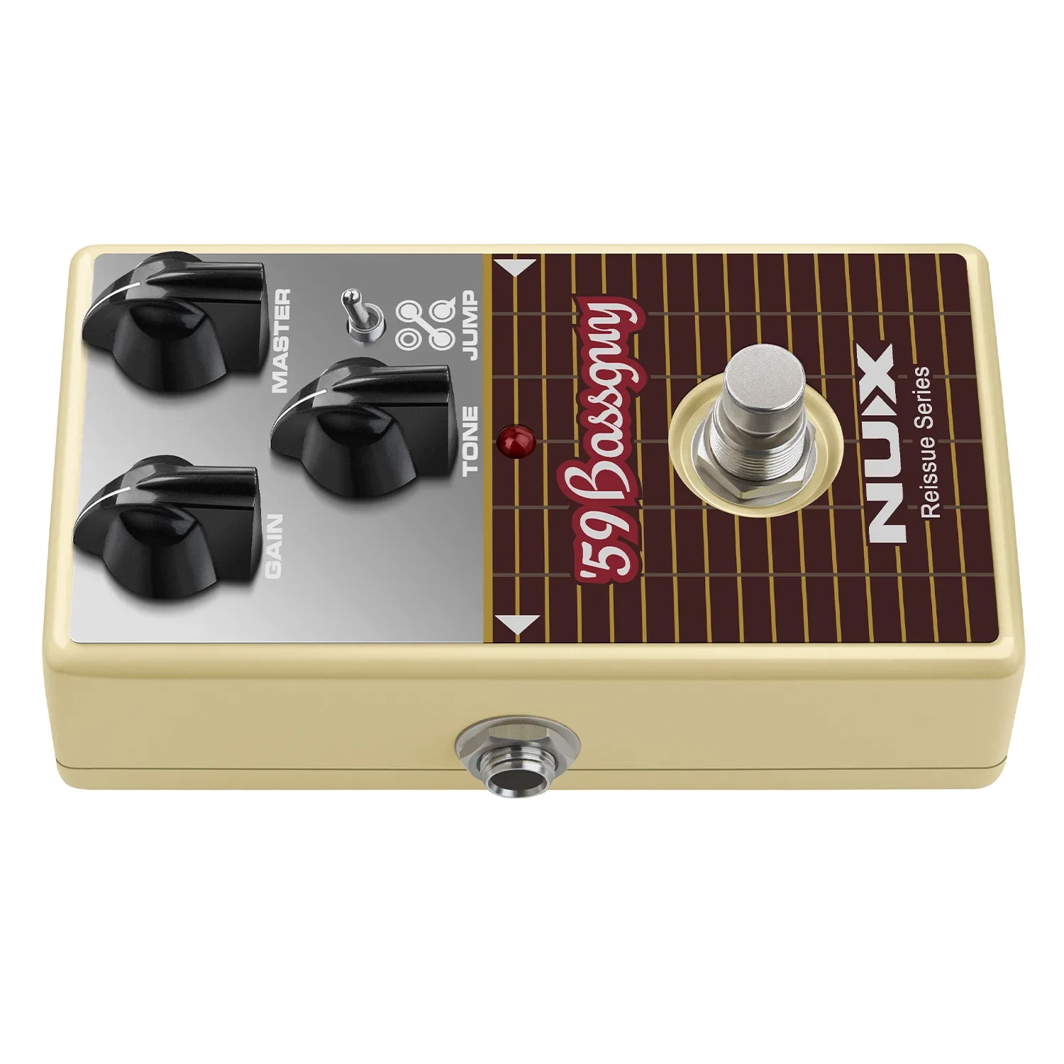 The NUX ’59 Bassguy from the Reissue series captures the legendary tone of the Fender ’59 Bassman amp. Featuring three intuitive controls - GAIN, MASTER, and VOLUME - users can fine-tune their sound to perfection! What sets the ’59 Bassguy apart is the unique JUMP switch, which faithfully simulates the iconic ‘Jumpering’ effect of the Fender ’59 Bassman. With a simple flip of the switch, players can easily toggle between two distinct tones, offering that classic vintage "chime" on the standard setting, and the thicker, saturated gain sounds produced by jumping the two channels of the classic amp upon which this pedal is based!