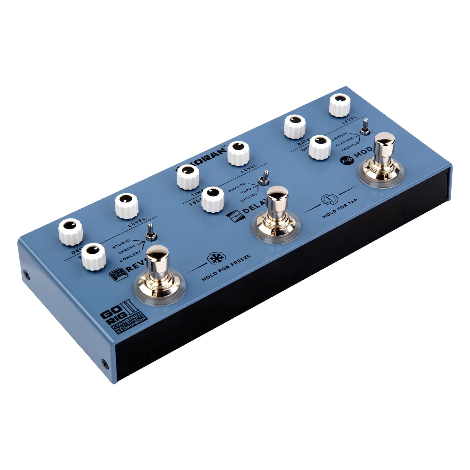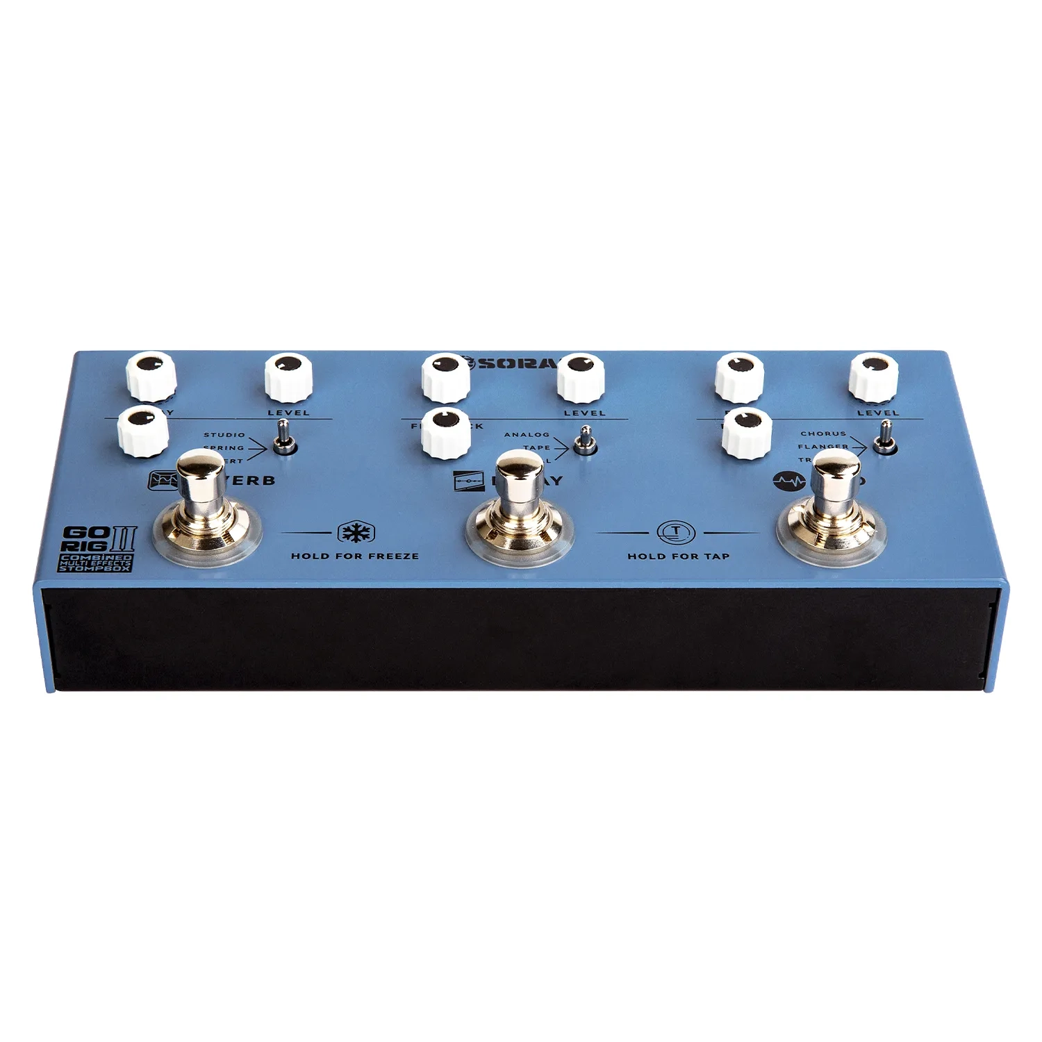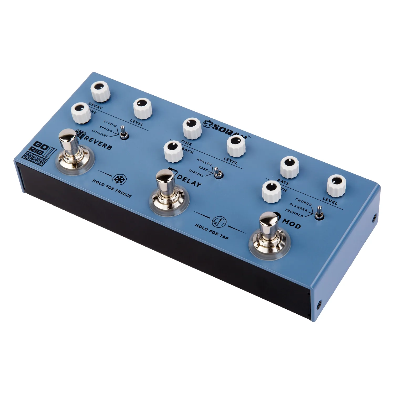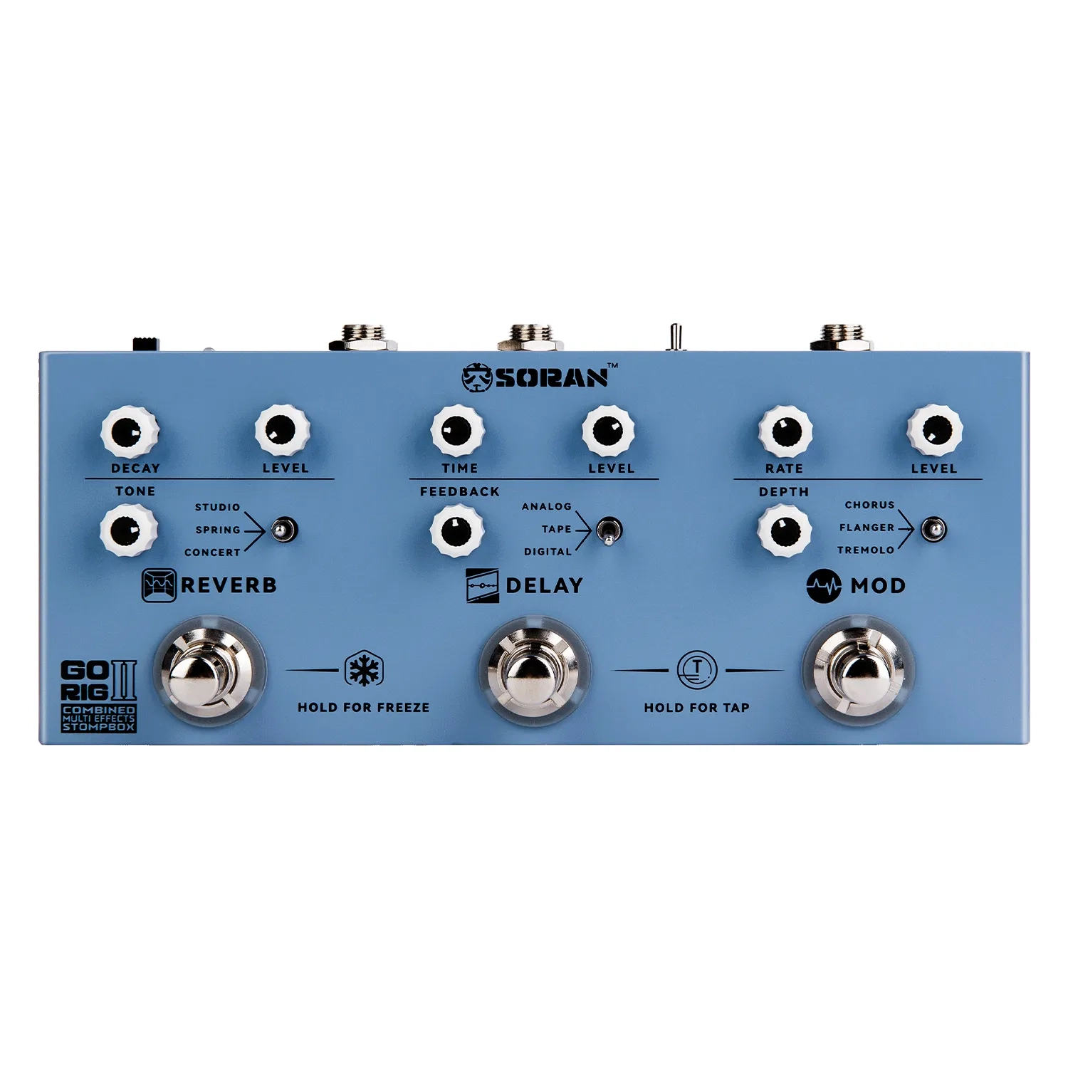 The Soran Go Rig II is a compact digital effects unit that combines modulation, delay, and reverb, designed for guitarists who want high-quality tone and effortless operation. With three classic modulation effects, three delay types, and three reverb modes, it spans everything from warm vintage textures to modern cutting-edge tones, making it ideal for songwriting, rehearsals, and live performance.