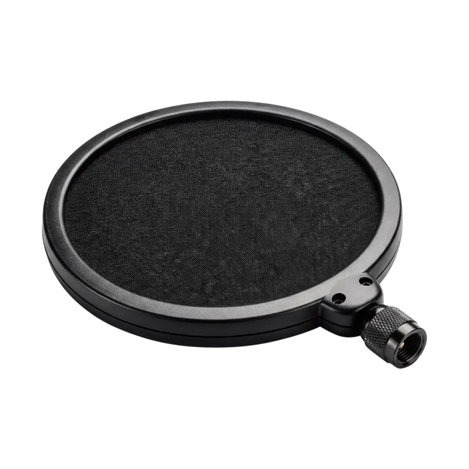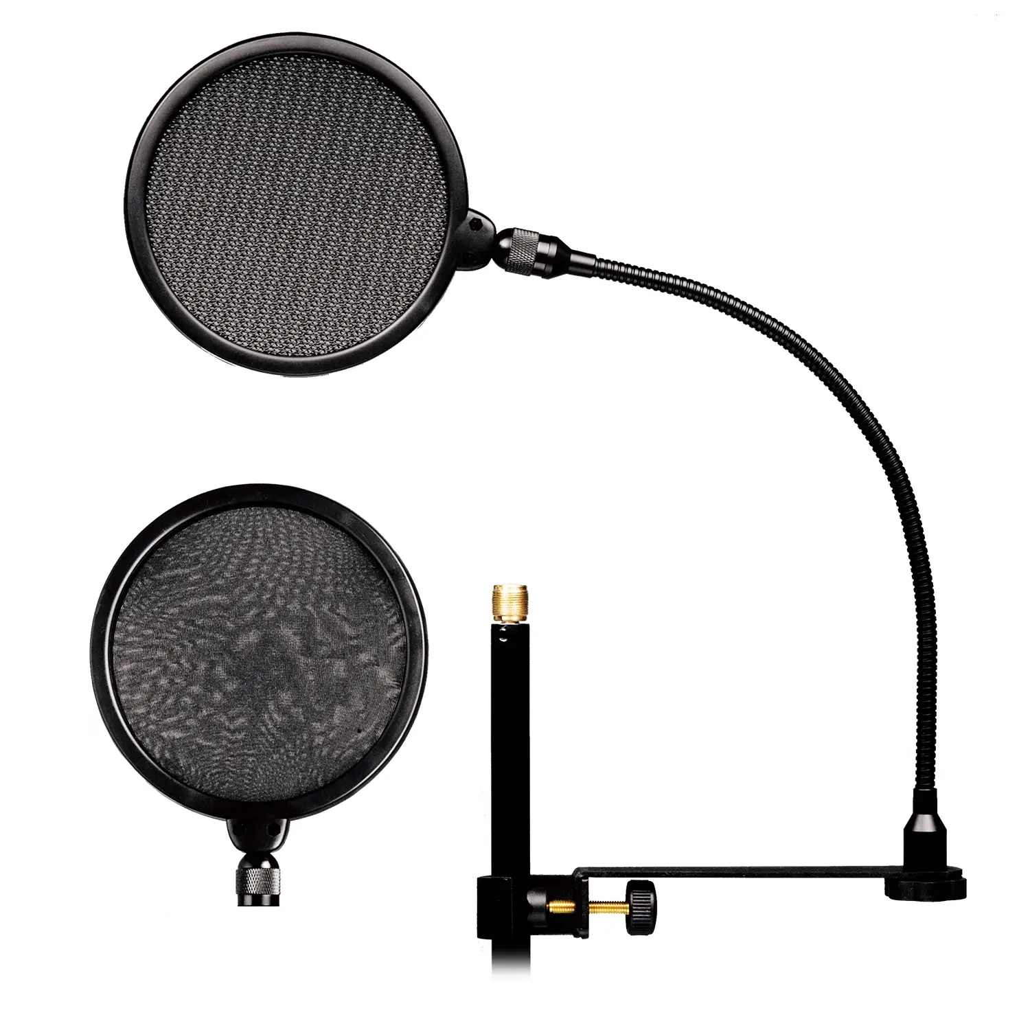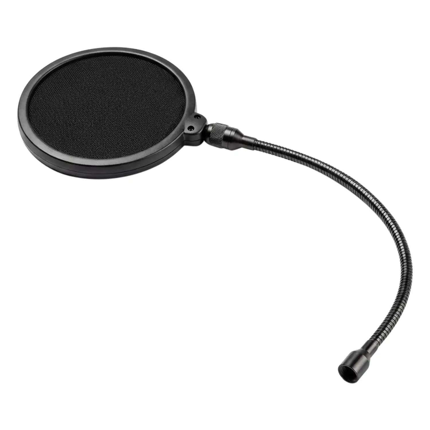 The HM18AG is a professional double-layer pop filter. It includes 2 screens, made of carbon fibre steel, and nylon silk screen fabric. With a 5/8" threaded adapter, the HM18AG can be mounted on a microphone stand to reduce the popping sounds that plosives can introduce to the recording process. It will not affect high-frequency response.